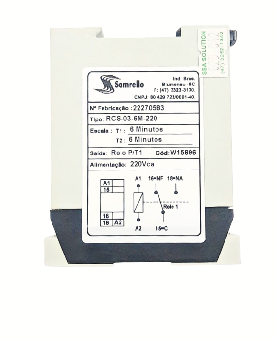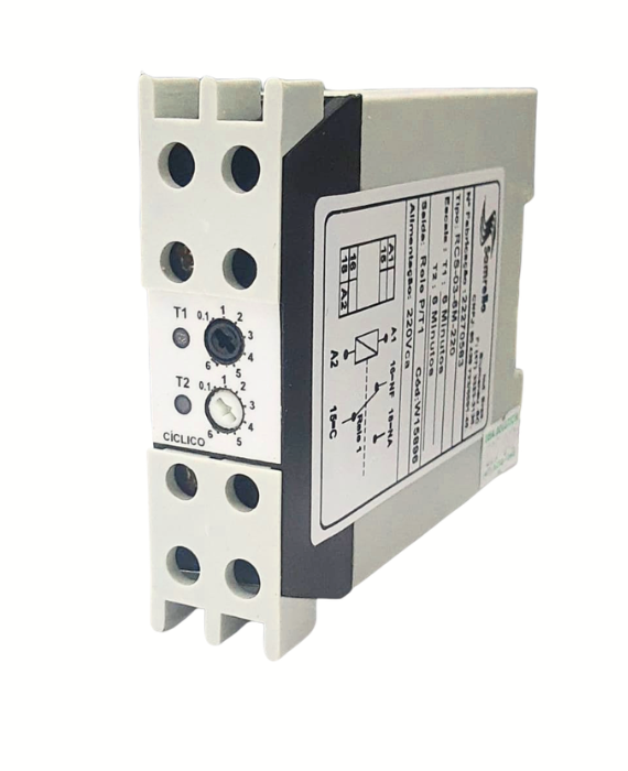 O relé temporizador cíclico RCS-03-6M-220 (cód. 15896) é um dispositivo eletrônico utilizado para realizar ciclos automáticos de acionamento e desligamento, operando com alimentação em 220Vca / 60Hz. É indicado para controle intermitente de cargas elétricas em sistemas de automação simples.