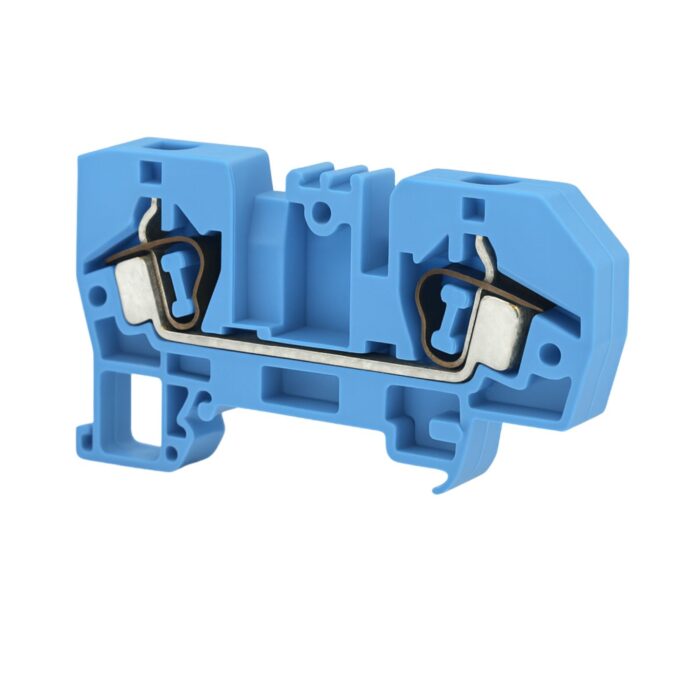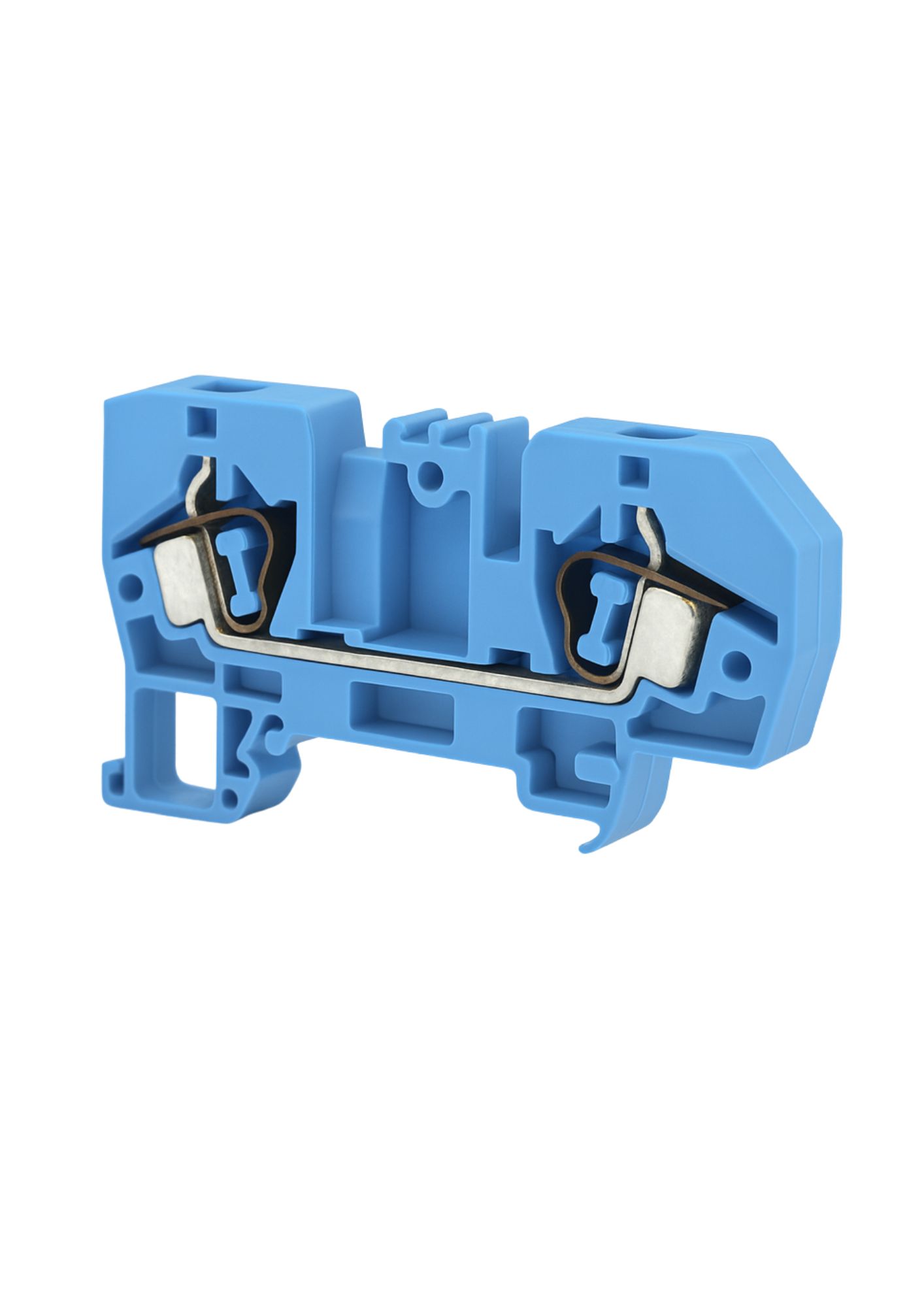 O Borne de Mola 6 mm² Azul CSC6T-BU da Connectwell é projetado para facilitar a conexão de condutores de até 6 mm², utilizando um sistema de mola que garante uma instalação rápida e segura. Este tipo de borne é ideal para aplicações que exigem solicitações elétricas confiáveis em trilhos DIN.