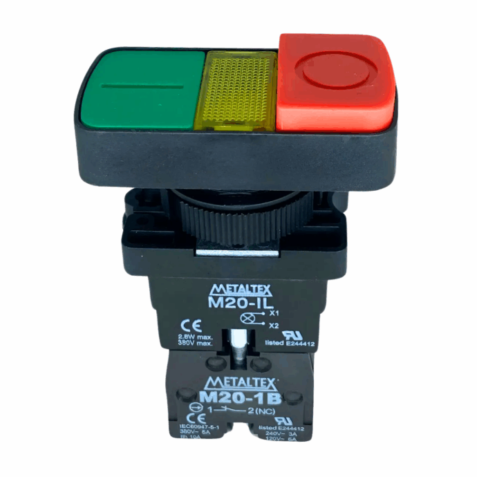 O P20IDL-Y7-1C é um botão duplo iluminado de 22 mm, fabricado em plástico, projetado para aplicações industriais que mantêm alta durabilidade e confiabilidade.