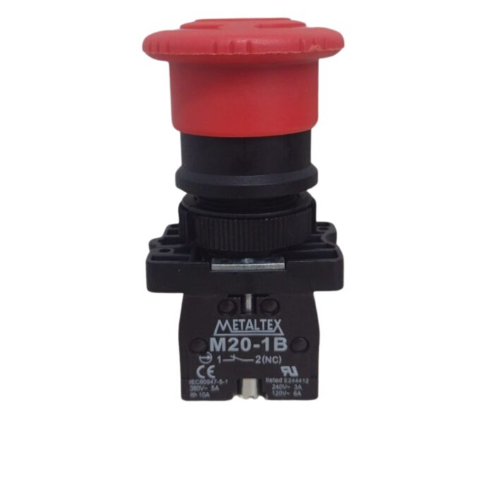 Botão de emergência tipo cogumelo com trava mecânica, diâmetro de 22 mm, na cor vermelha, modelo P20AKR-R-1B, equipado com 1 contato NF (normalmente fechado). Desenvolvido para garantir segurança em máquinas e painéis de automação, permitindo parada imediata em situações de risco.