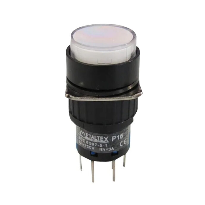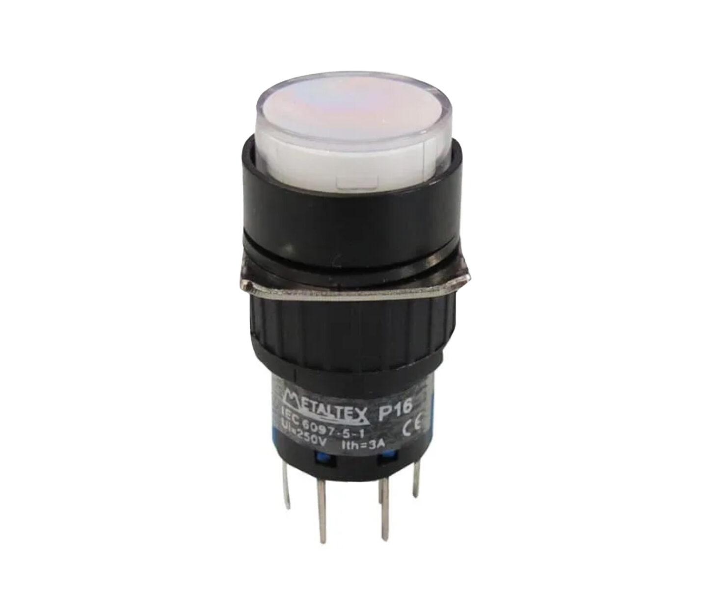 Este botão possui um design compacto, adequado para painéis com furação de 16 mm. A cor branca facilita a identificação visual, e a iluminação integrada por LED proporciona uma indicação clara do estado de operação. O formato retangular oferece uma estética diferenciada e pode ser preferível em determinados projetos de painel.