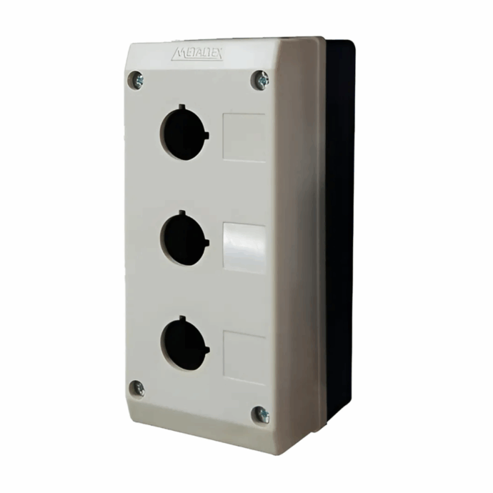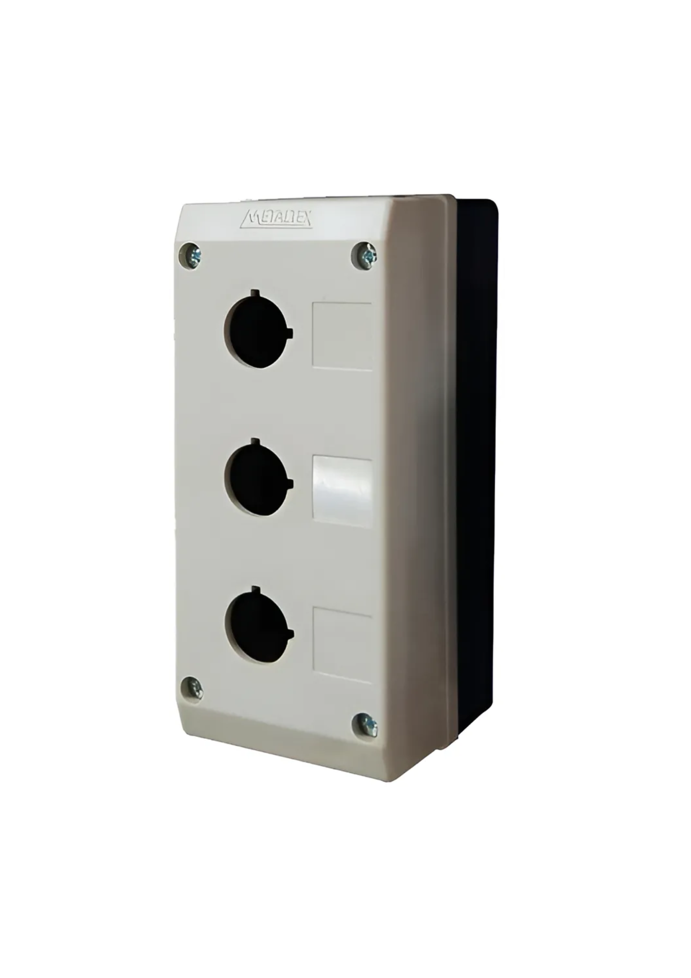 A Caixa Plástica TN2-B3 é um modelo de botoeira de comando com 3 furos padrão Ø 22 mm, projetada para montagem de botões, chaves seletoras e sinaleiros em painéis e máquinas industriais.