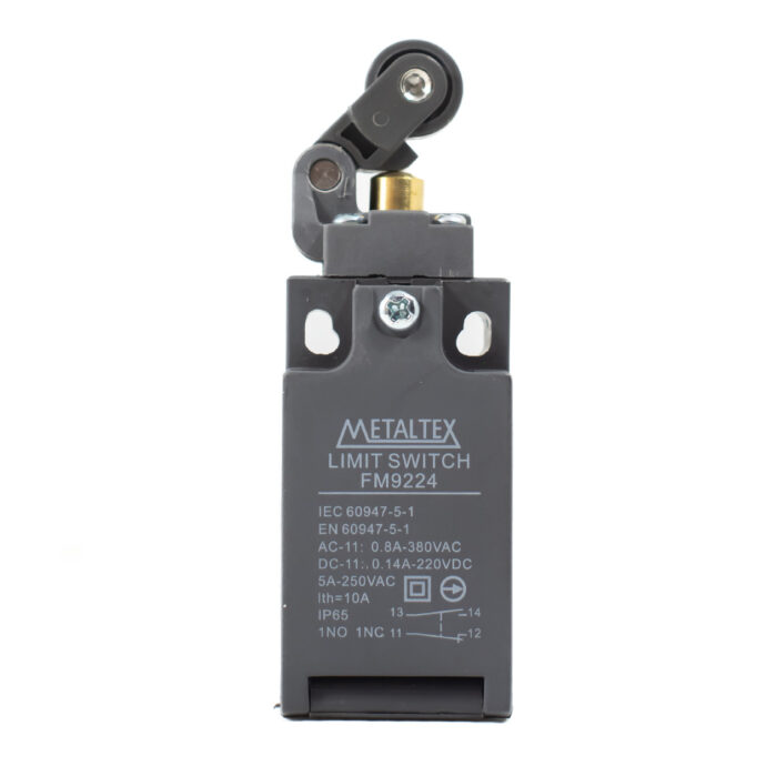 Chave de fim de curso com corpo plástico e atuador por rolete, utilizada para detectar posição ou limite de movimento em máquinas e equipamentos. O acionamento ocorre quando o rolete é pressionado por uma peça móvel, comutando os contatos internos de forma rápida e precisa. O invólucro plástico reforçado garante boa resistência mecânica, leveza e isolamento, sendo adequada para aplicações de automação, linhas de produção e mecanismos de fim de curso.