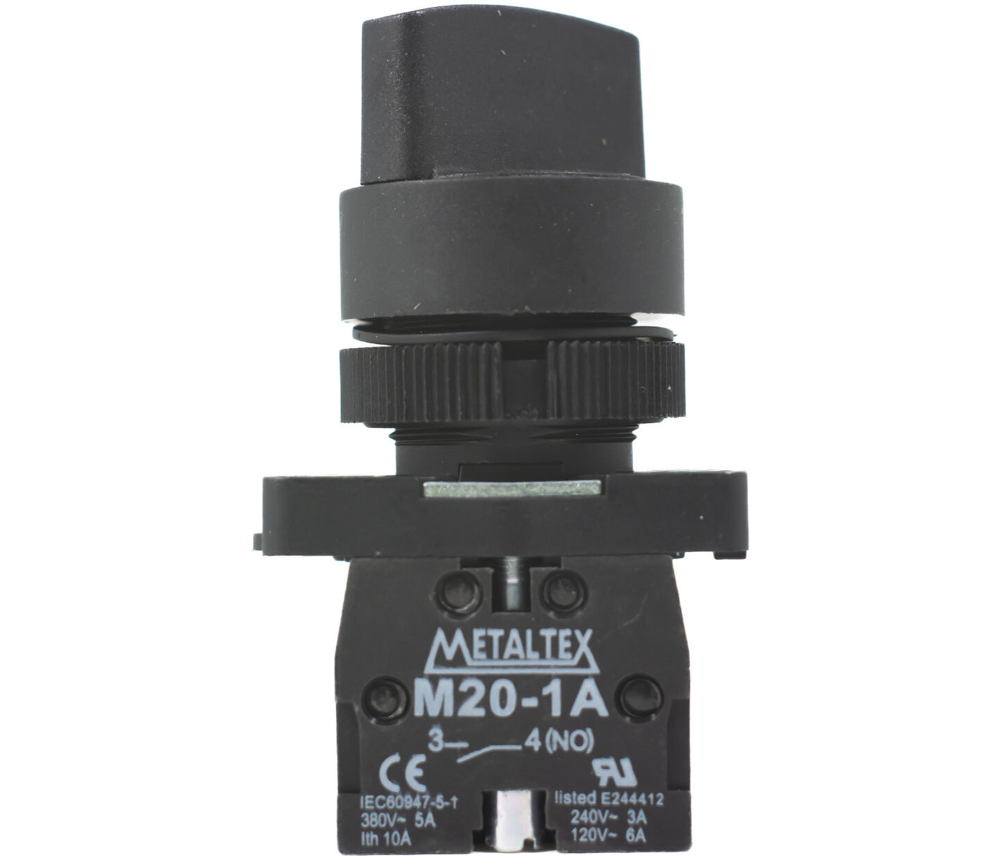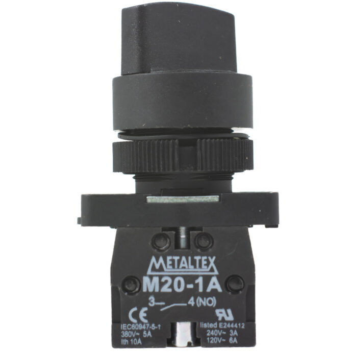 A P20SCR2-B-1A é uma chave seletora de 2 posições fixas, fabricada pela Metaltex, projetada para instalação em painéis de controle com furação de 22 mm. Este modelo possui um bloco de contato normalmente aberto (1NA) e é ideal para aplicações que requerem a seleção entre duas opções distintas.