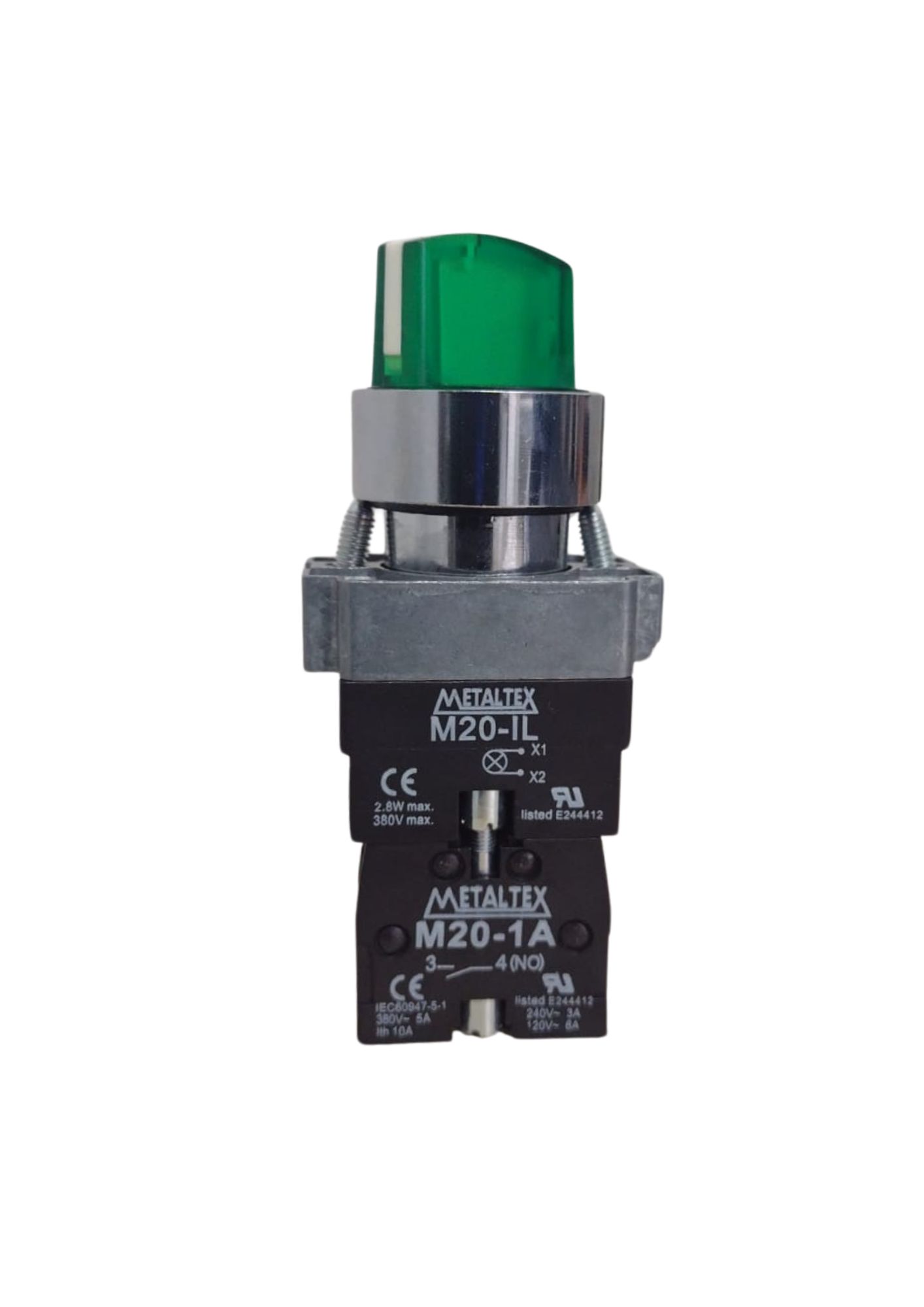A Chave Seletora Metálica Iluminada Metaltex M20ICR2-G-1A é um dispositivo de comando utilizado em painéis elétricos e sistemas de automação industrial.