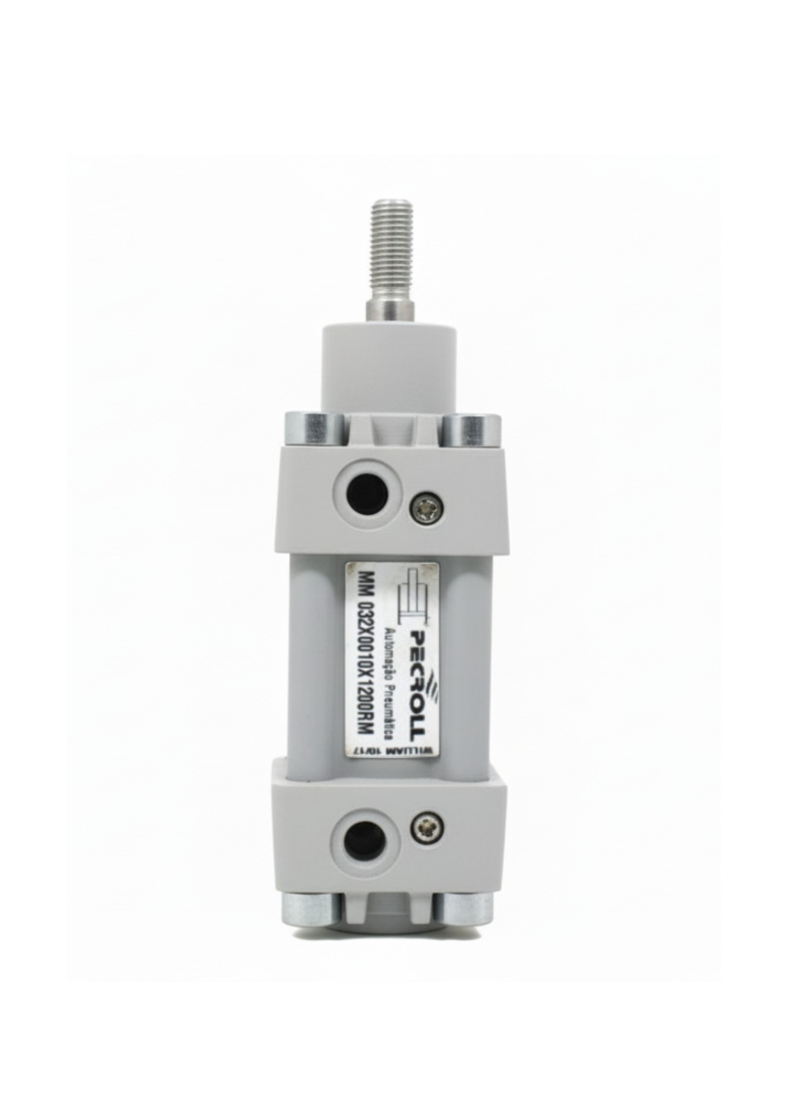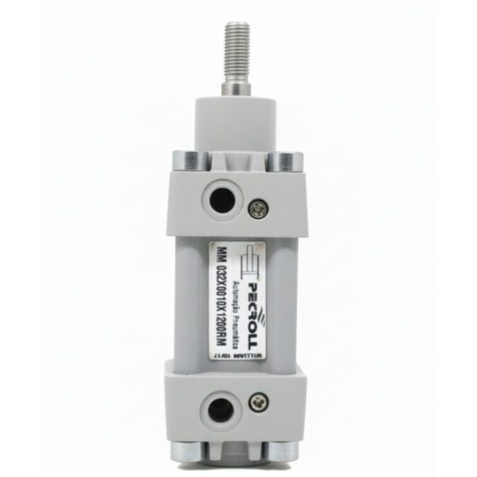 Cilindro pneumático tipo "Mickey Mouse" conforme norma ISO 6432, com diâmetro de êmbolo de 32mm e curso de 100mm. Modelo de simples ação com retorno por mola, ideal para aplicações compactas e de baixa demanda de força.