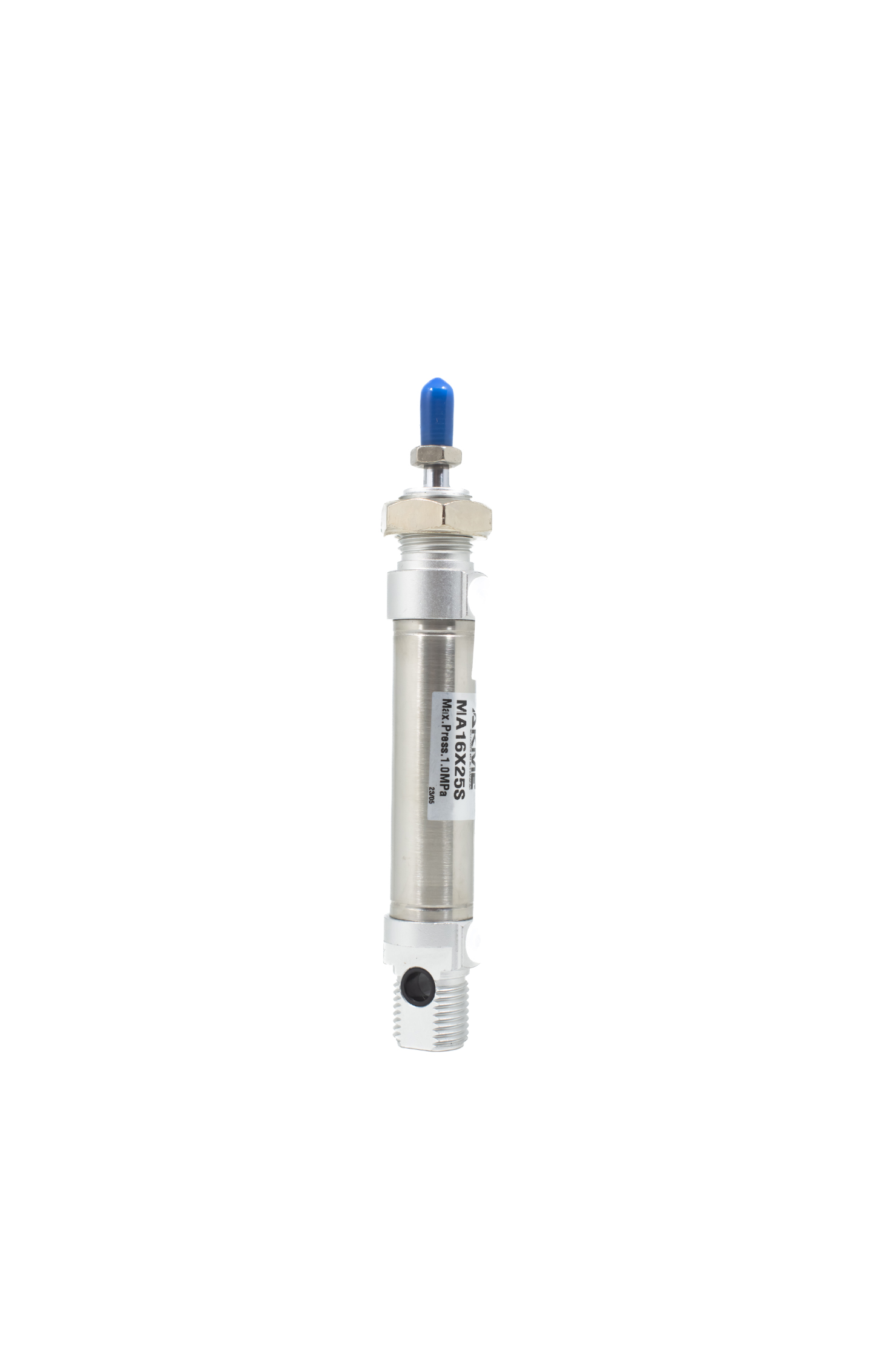 Cilindro pneumático mini ISO modelo MA16X25S, com diâmetro de 16 mm e curso de 25 mm. Compacto e eficiente, ideal para aplicações que desativam um controle preciso do movimento em espaços reduzidos.