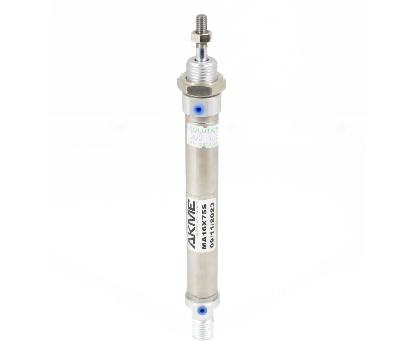 Cilindro pneumático mini ISO modelo MA16X75S, com diâmetro de 16 mm e curso de 75 mm. Compacto e leve, é ideal para aplicações que exigem precisão e eficiência em espaços limitados.