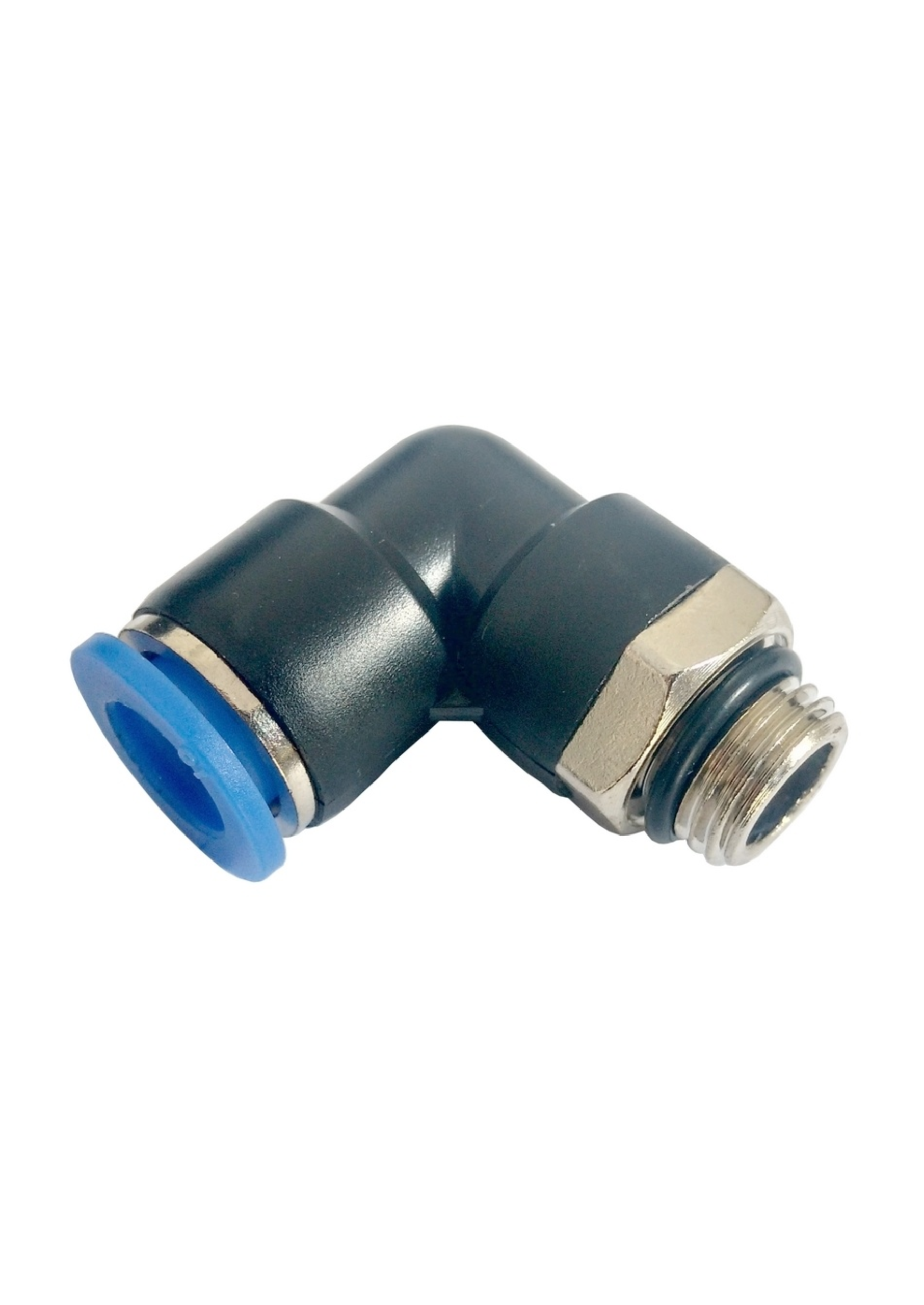 Conexão cotovelo 12 mm x 3/8" BSP para sistemas pneumáticos, utilizada para realizar a mudança de direção da tubulação em 90°, garantindo vedação eficiente e ligação segura entre a mangueira e a rosca.