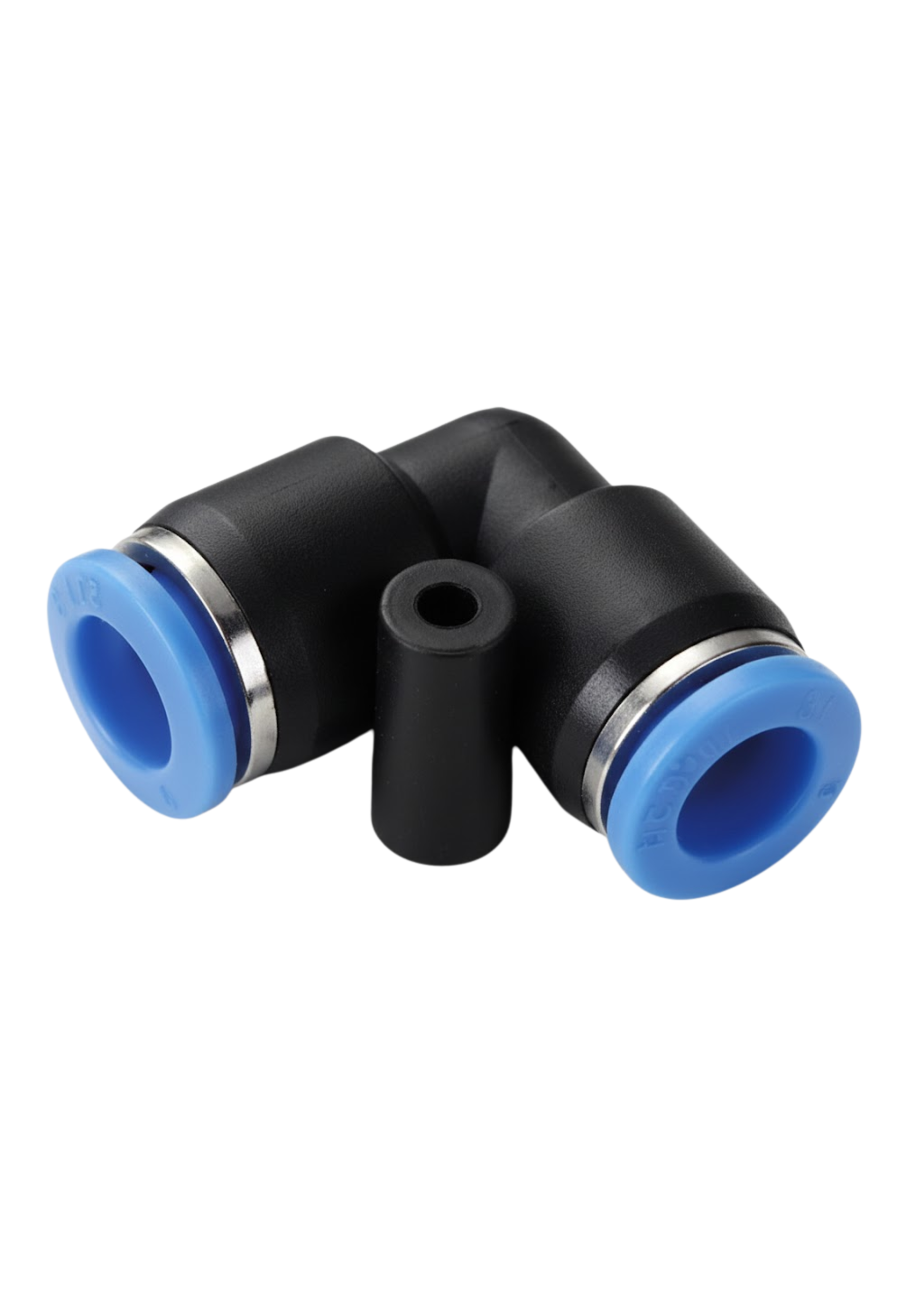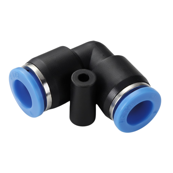 É um componente em formato de "L" (cotovelo) que serve para unir dois tubos pneumáticos do mesmo diâmetro, realizando uma curva de 90 graus na linha. Por ser uma "emenda" ou "união", ela possui conexões de engate rápido em ambas as extremidades, sem roscas. É essencial para rotear a tubulação em cantos ou em espaços confinados.