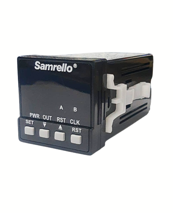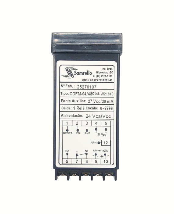 Controlador digital multifunção modelo CDFM-04/48-24, projetado para atuar como contador, temporizador e medidor de frequência em aplicações industriais. Permite monitorar e controlar eventos, tempo e sinais pulsados em máquinas e processos automatizados, com visualização em display digital e possibilidade de acionamento de saída conforme parâmetros configurados.