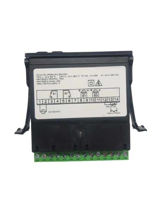 - Entrada: sensor de temperatura (termopar ou PT100, conforme configuração)
