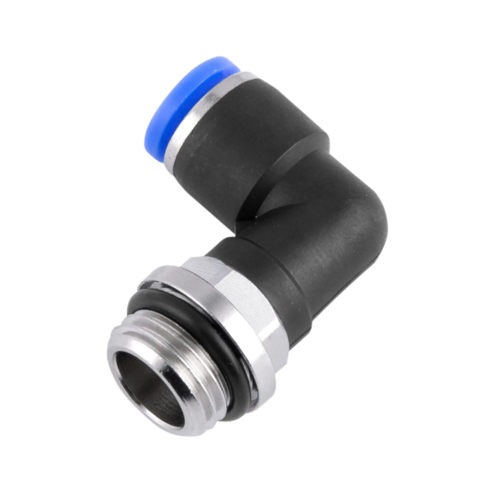Cotovelo macho 6 mm x 1/2" BSP para sistemas pneumáticos, utilizado para realizar a mudança de direção da tubulação em 90°, garantindo conexão segura e vedação eficiente entre a mangueira e a rosca.