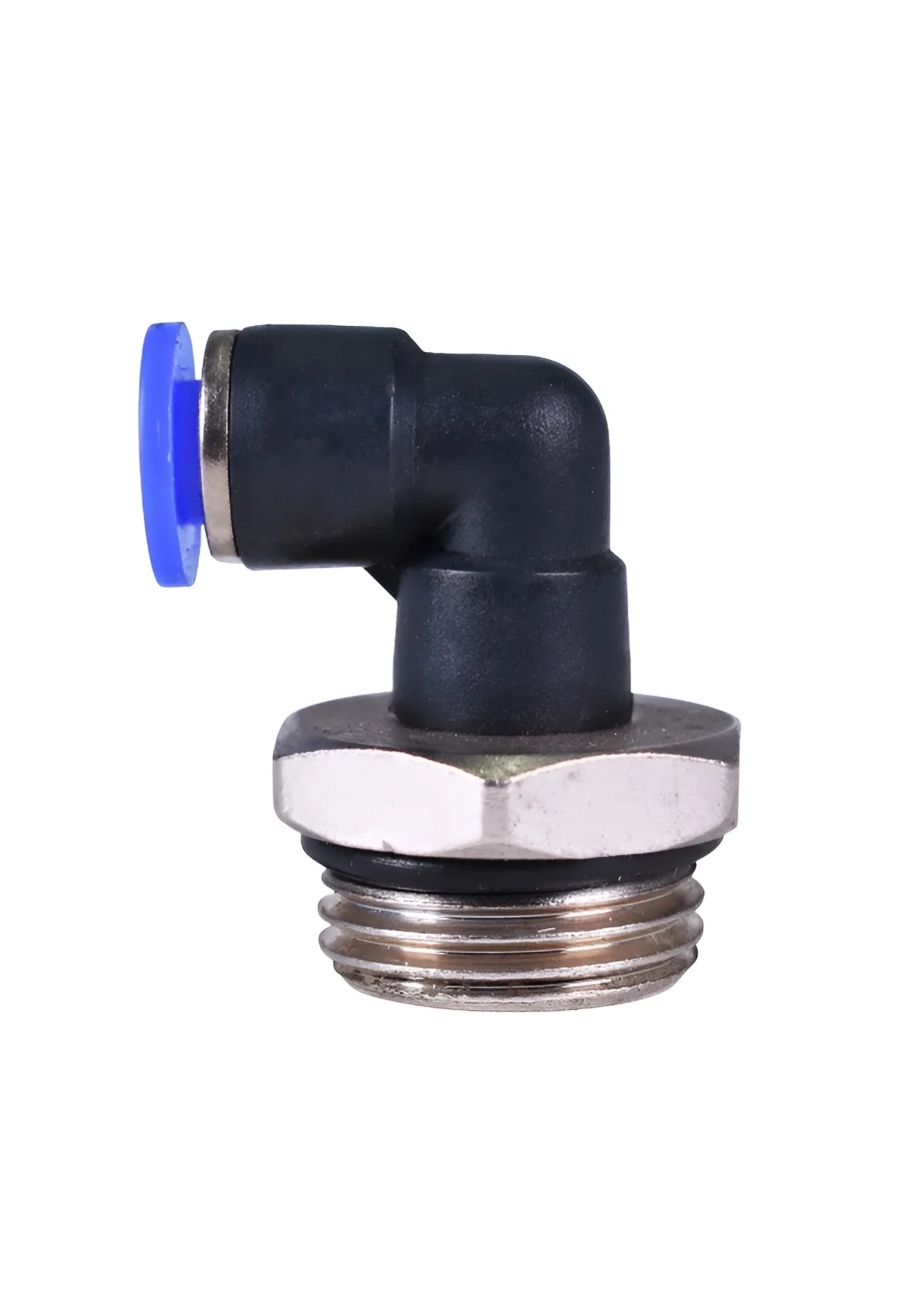 Cotovelo macho 10 mm x 1/2" BSPP para sistemas pneumáticos, utilizado para realizar a mudança de direção da tubulação em 90°, garantindo vedação eficiente e conexão segura entre a mangueira e a rosca.