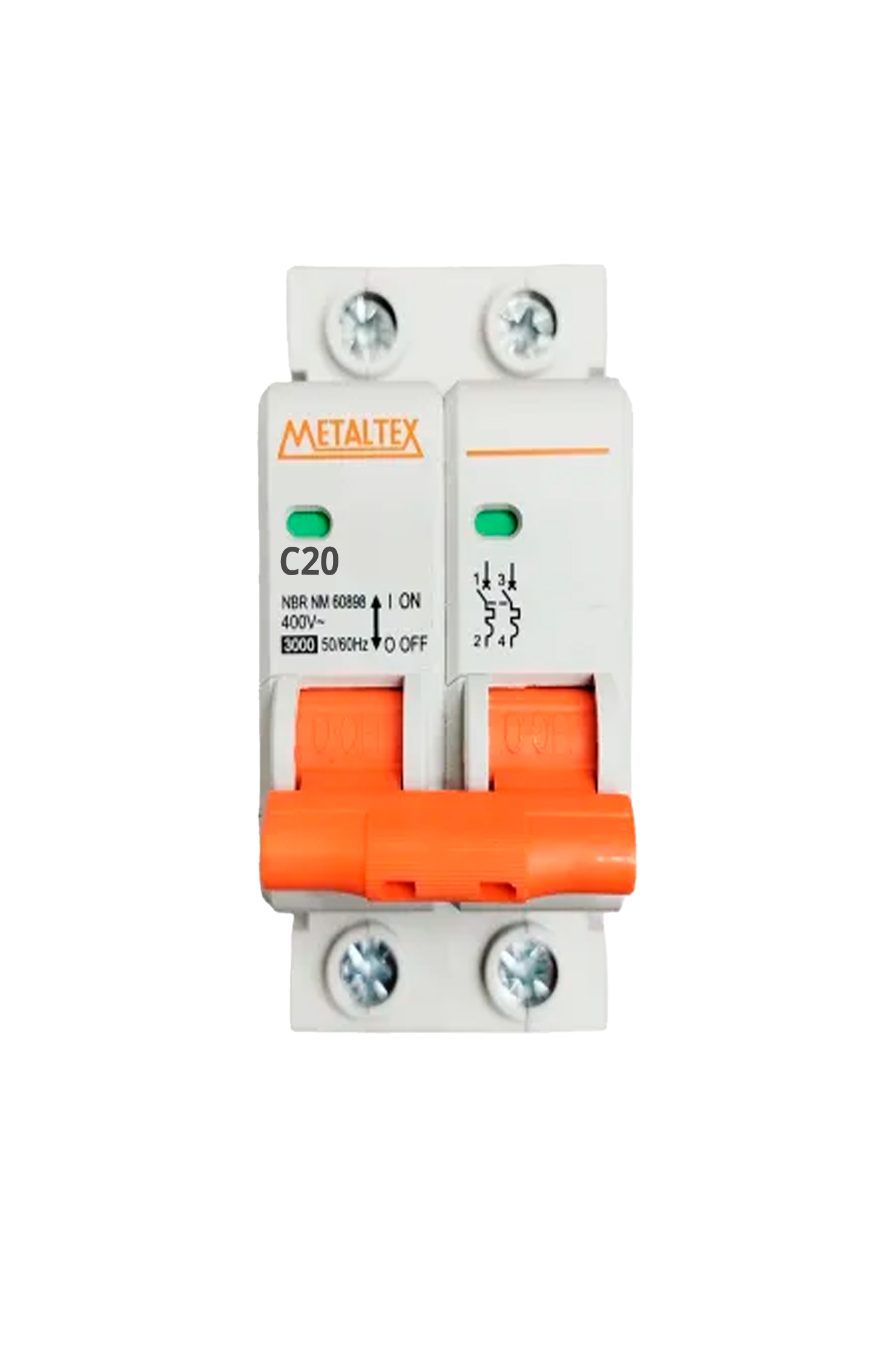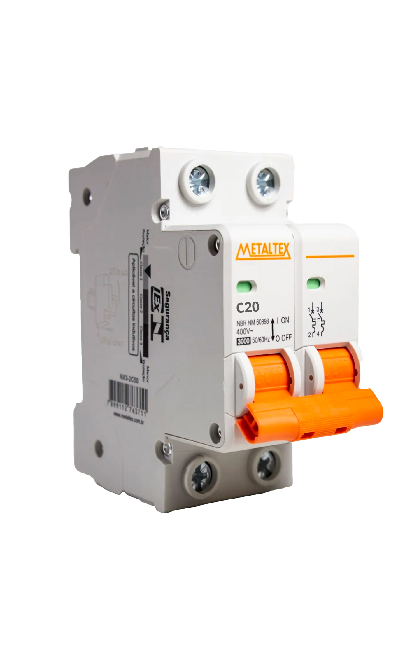 O N3-2C20 é um mini disjuntor bipolar de 20A, curva C, fabricado pela Metaltex.