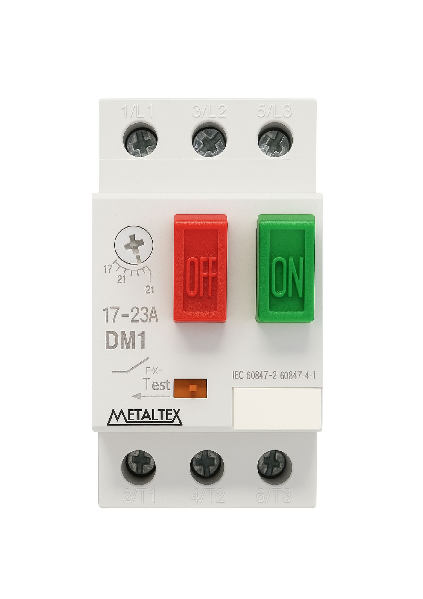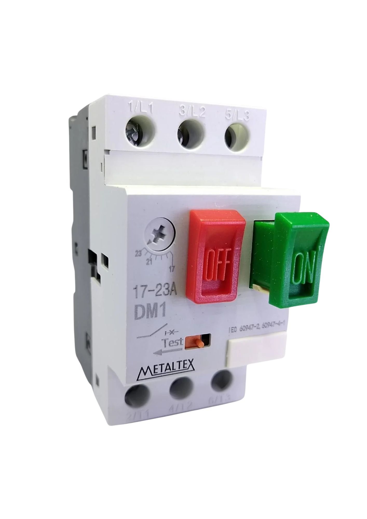 O DM1-23A é um disjuntor motor tripolar fabricado pela Metaltex, projetado para a manobra e proteção de motores assíncronos tipo gaiola de esquilo. Este dispositivo oferece proteção contra sobrecarga, curto-circuito, falta de fase e subtensão, atendendo às normas IEC 60947-1, IEC 60947-2, IEC 60947-4-1, IEC 60947-5-1 e DIN VDE 0106.