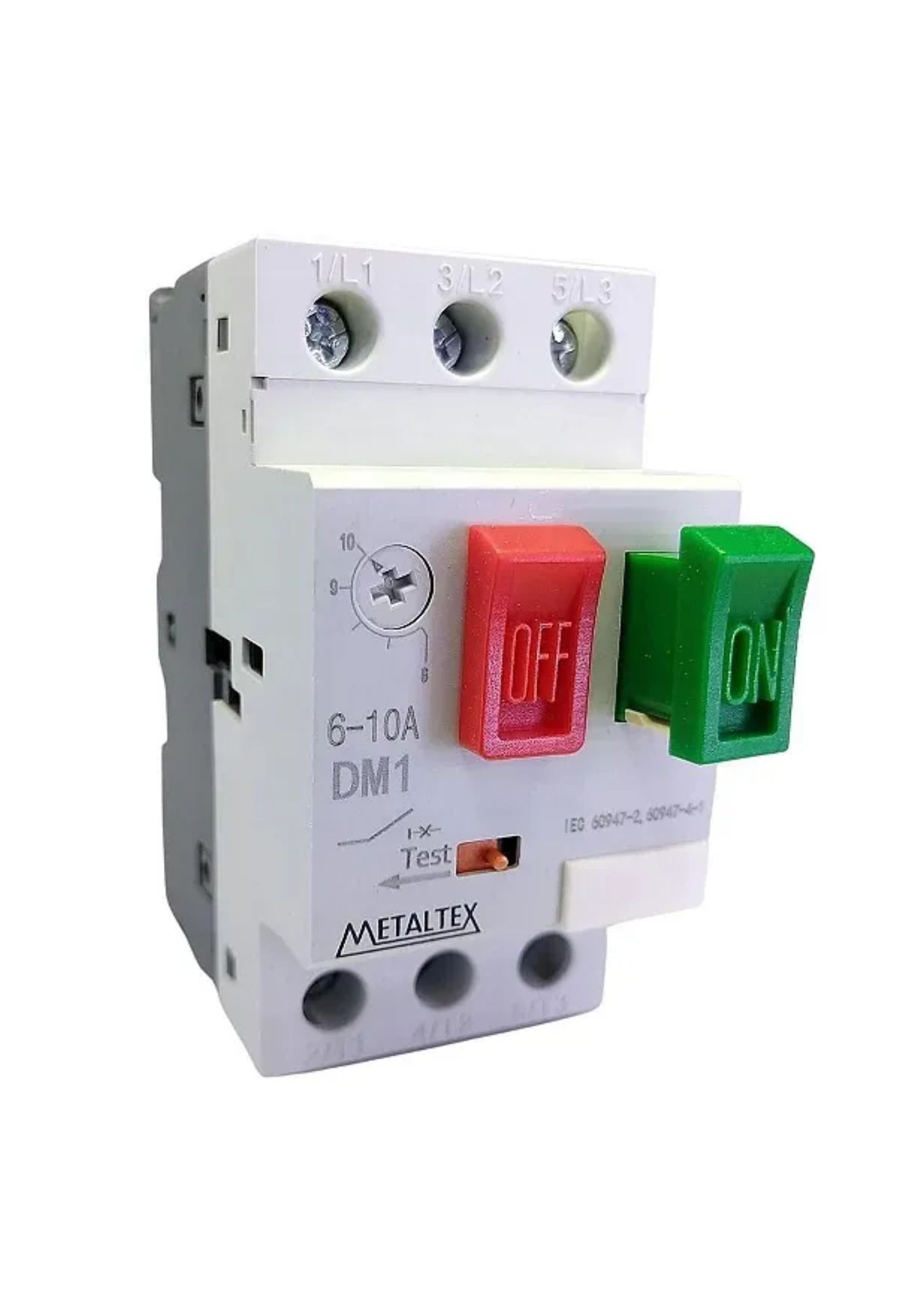 O DM3-10A é um disjuntor motor tripolar fabricado pela Metaltex, projetado para a manobra e proteção de motores assíncronos tipo gaiola de esquilo. Este dispositivo oferece proteção contra sobrecarga, curto-circuito, falta de fase e subtensão, atendendo às normas IEC 60947-1, IEC 60947-2, IEC 60947-4-1, IEC 60947-5-1 e DIN VDE 0106.