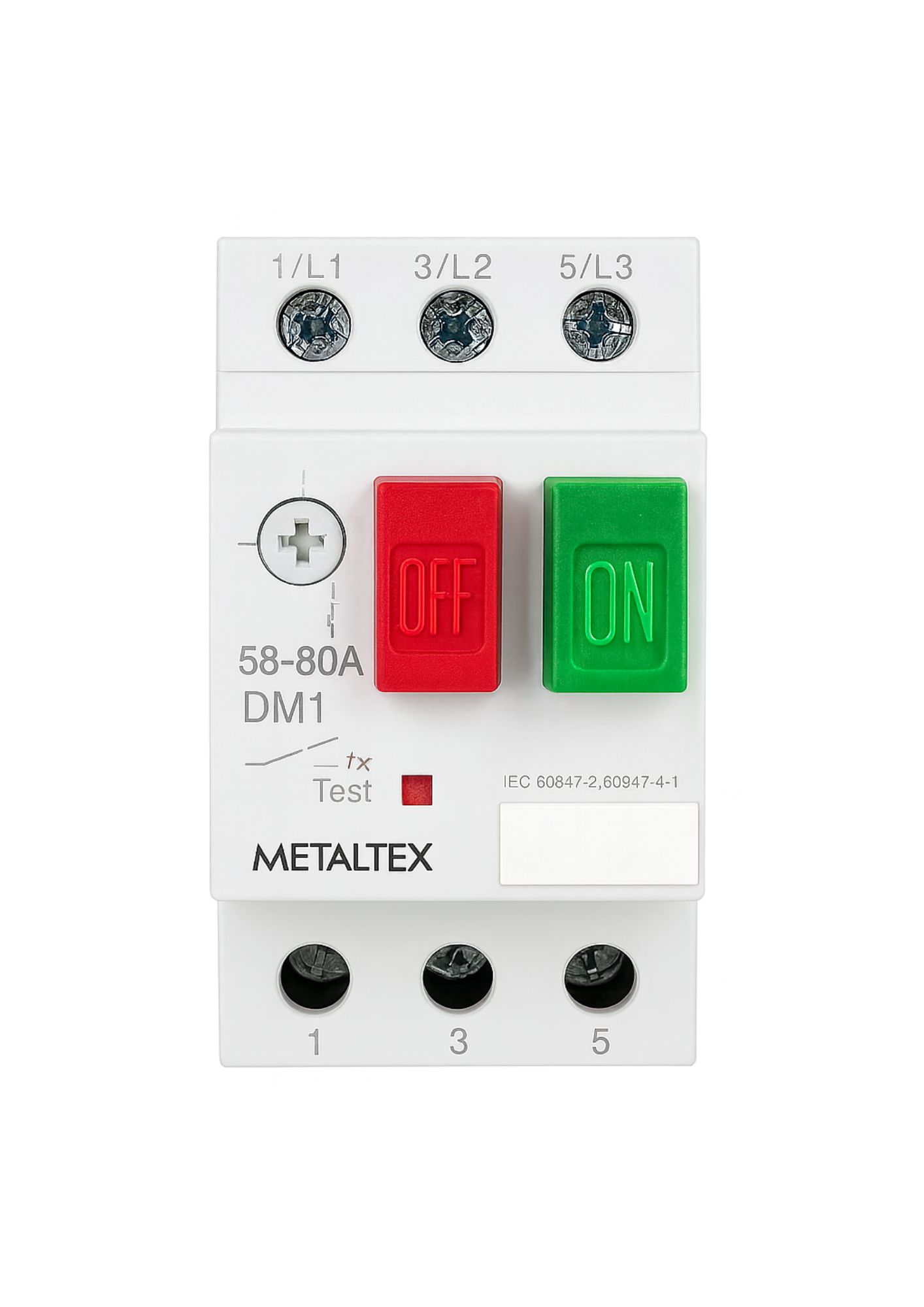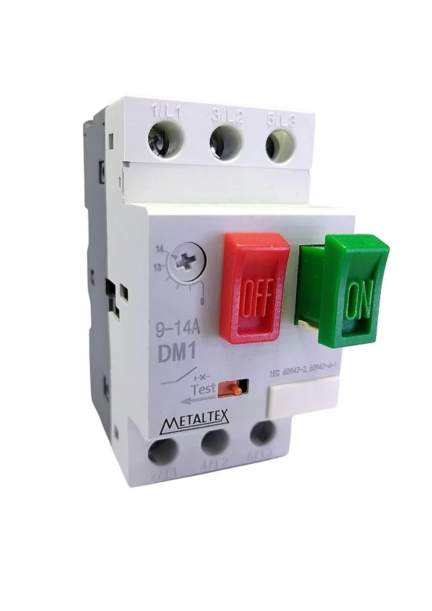 O DM1-14A é um disjuntor motor tripolar fabricado pela Metaltex, projetado para a manobra e proteção de motores assíncronos tipo gaiola de esquilo. Este dispositivo oferece proteção contra sobrecarga, curto-circuito, falta de fase e subtensão, atendendo às normas IEC 60947-1, IEC 60947-2, IEC 60947-4-1, IEC 60947-5-1 e DIN VDE 0106.