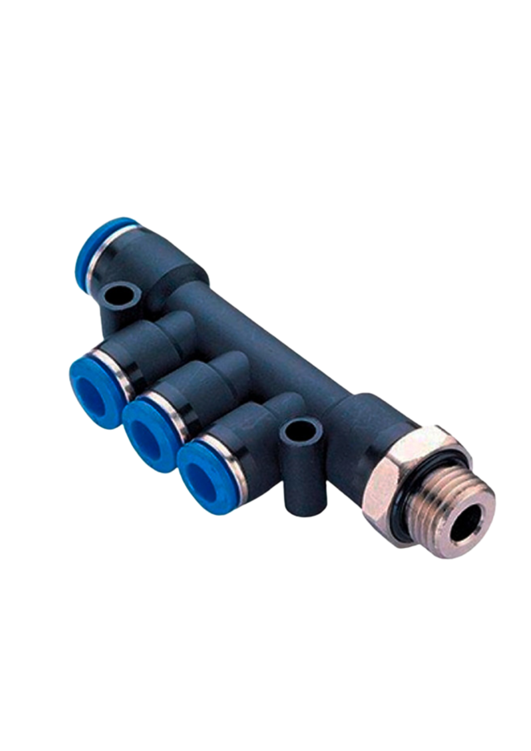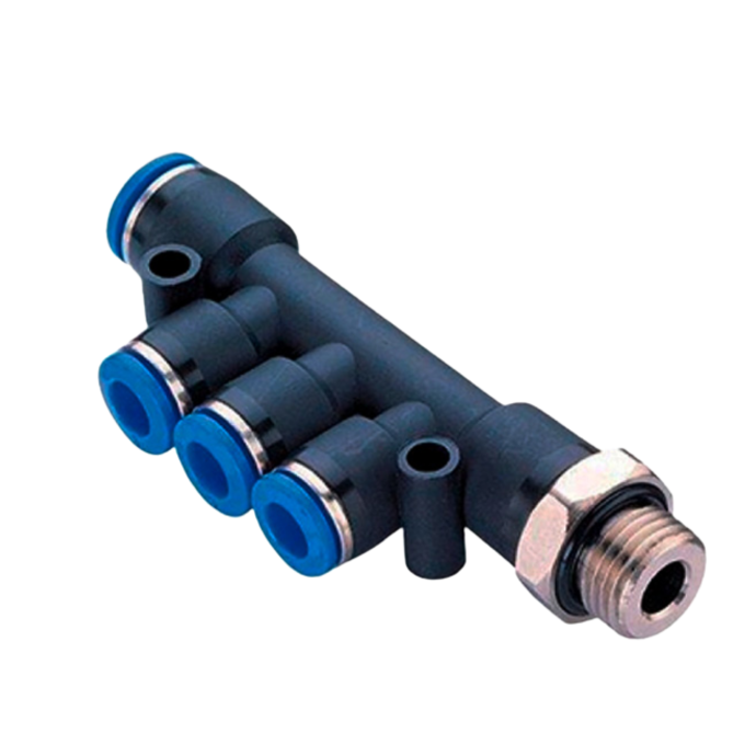 Distribuidor com redução 8 mm para 6 mm, utilizado em sistemas pneumáticos para derivar o fluxo de ar de uma linha principal para uma saída de menor diâmetro, garantindo conexão segura e vedação eficiente