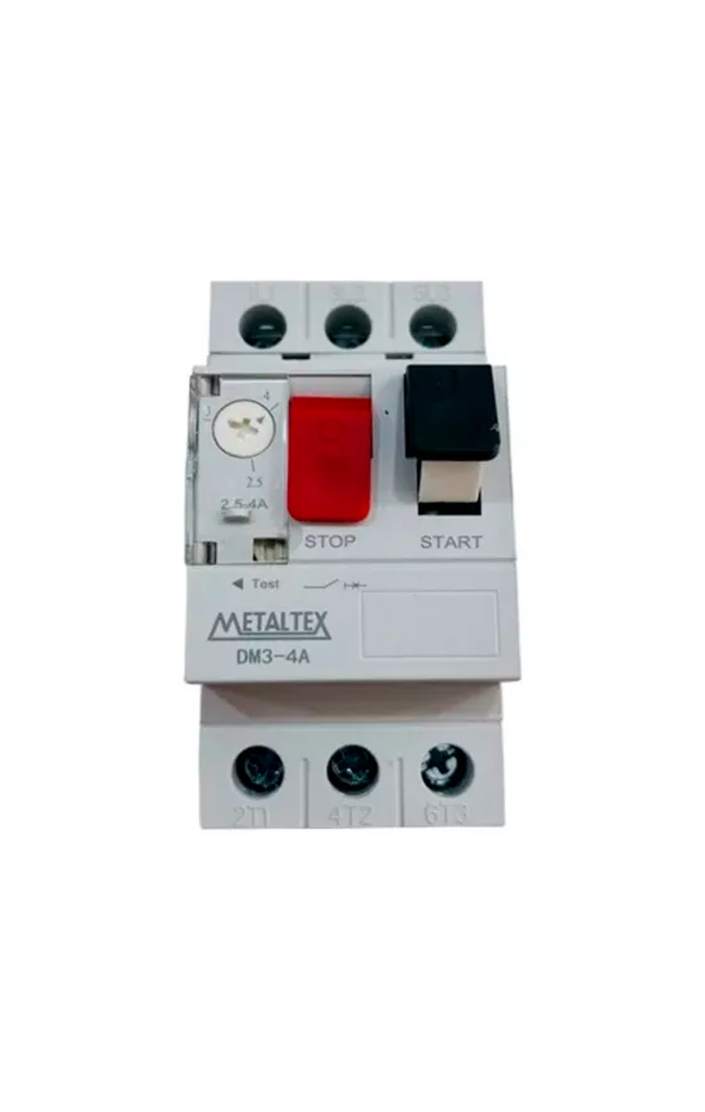 O DM3-4A é um disjuntor motor tripolar fabricado pela Metaltex, projetado para a manobra e proteção de motores assíncronos tipo gaiola de esquilo. Este dispositivo oferece proteção contra sobrecarga, curto-circuito, falta de fase e subtensão, atendendo às normas IEC 60947-1, IEC 60947-2, IEC 60947-4-1, IEC 60947-5-1 e DIN VDE 0106.