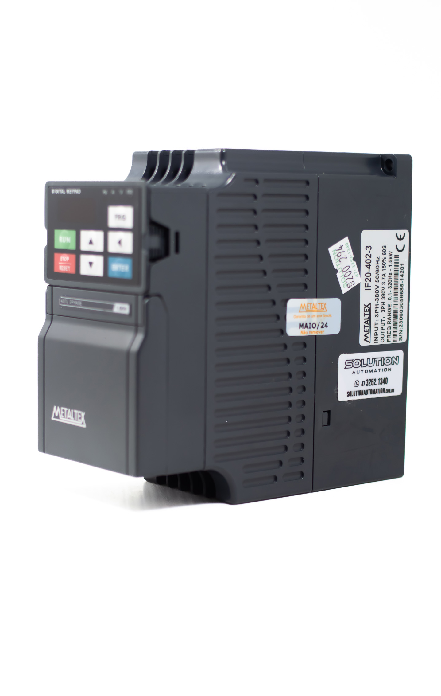 O inversor de frequência vetorial IF20-402-3 da Metaltex é projetado para controlar motores trifásicos de até 2 HP (1,5 kW) com alimentação trifásica de 380V. Utilizando controle vetorial sem sensor (sensorless) ou controle escalar V/F, este inversor oferece desempenho eficiente e preciso para diversas aplicações industriais.