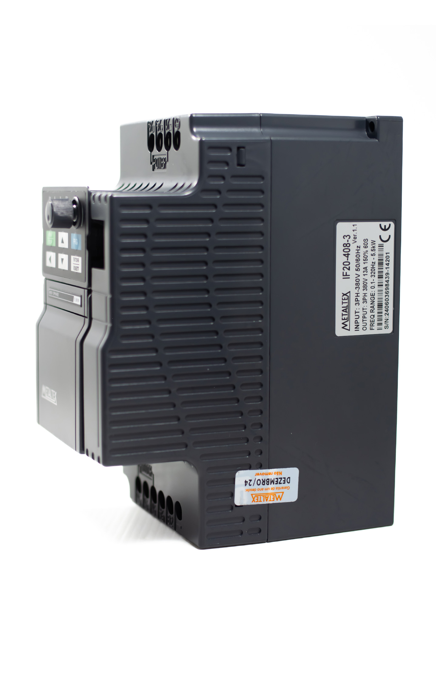 O inversor de frequência vetorial IF20-408-3 da Metaltex é projetado para controlar motores trifásicos de até 7,5 HP (5,5 kW) com alimentação trifásica de 380V. Este dispositivo utiliza controle vetorial sem sensor (sensorless) ou controle escalar V/F, proporcionando um controle preciso de velocidade e torque para diversas aplicações industriais.