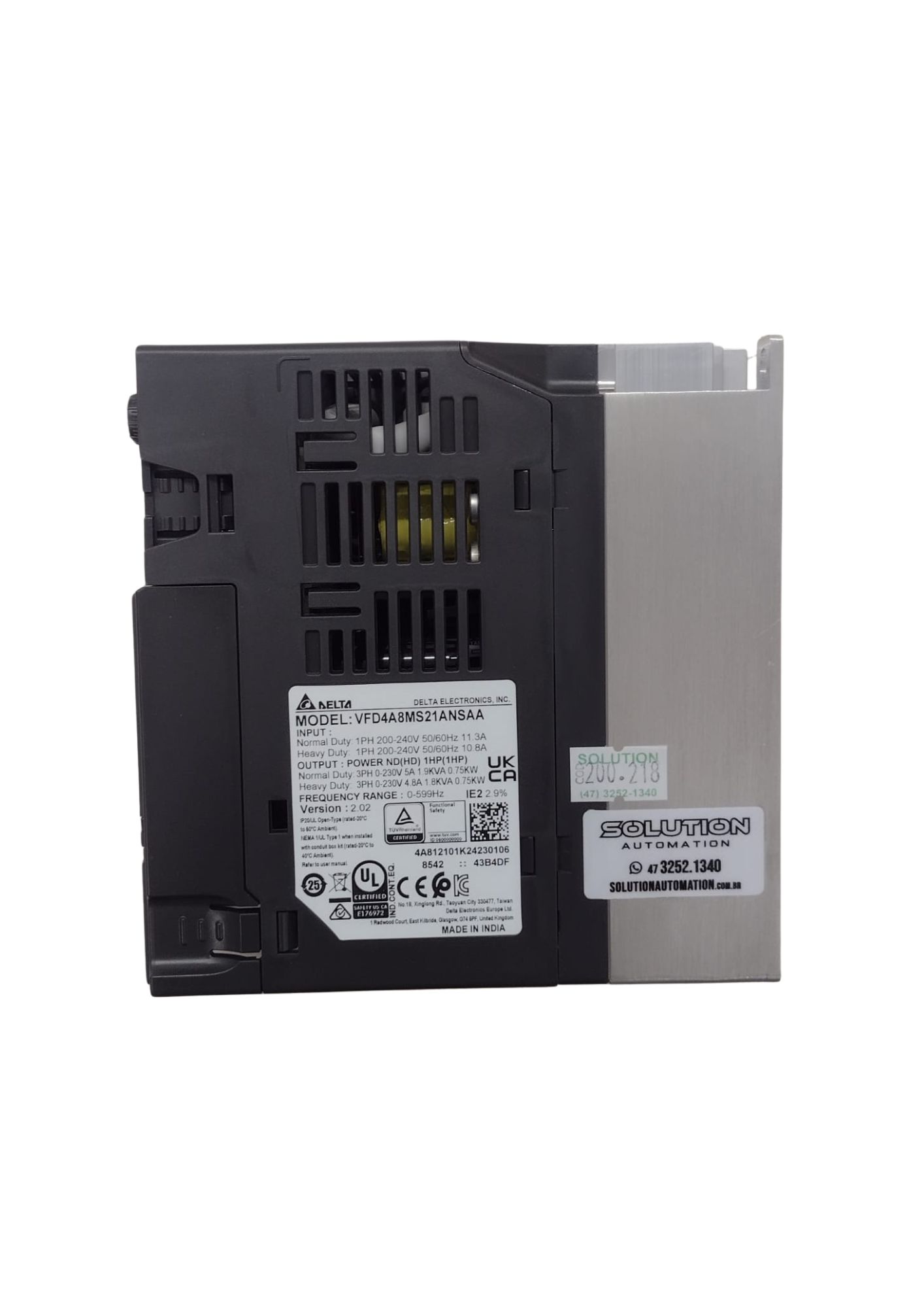 O inversor de frequência Delta VFD4A8MS21ANSAA faz parte da série MS300 e é projetado para controlar motores trifásicos de até 1 HP (0,75 kW), utilizando uma alimentação monofásica de 230 V AC. Este modelo é ideal para aplicações que requerem controle preciso de velocidade e torque em motores de indução (IM) e motores de ímã permanente (PM).