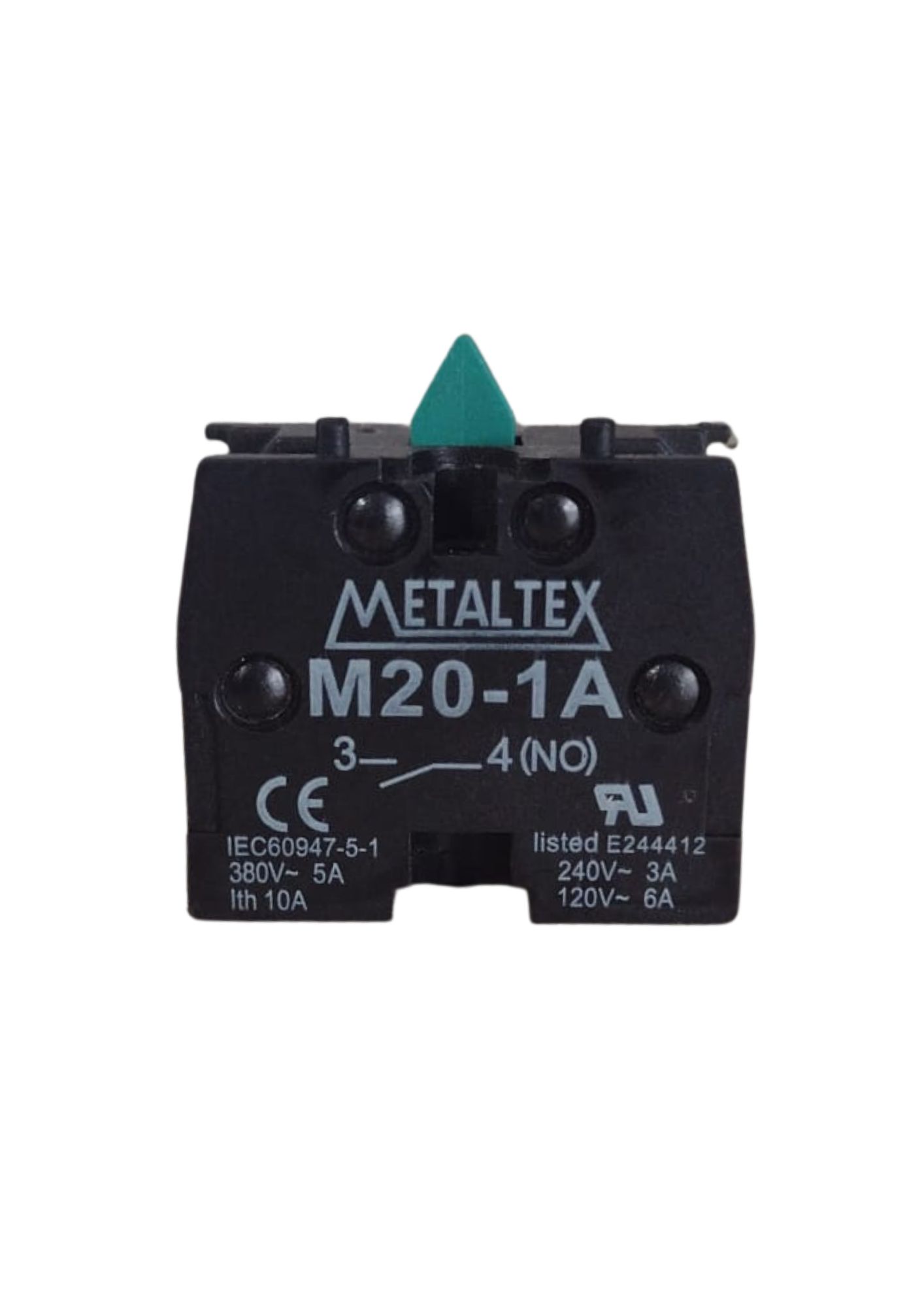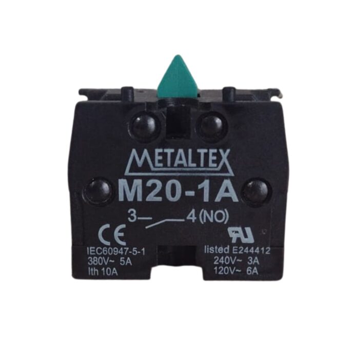 O Contato Auxiliar M20-1A é um módulo de contato 1NA (Normalmente Aberto) para botoeiras e seletores das linhas M20 e P20 Metaltex.