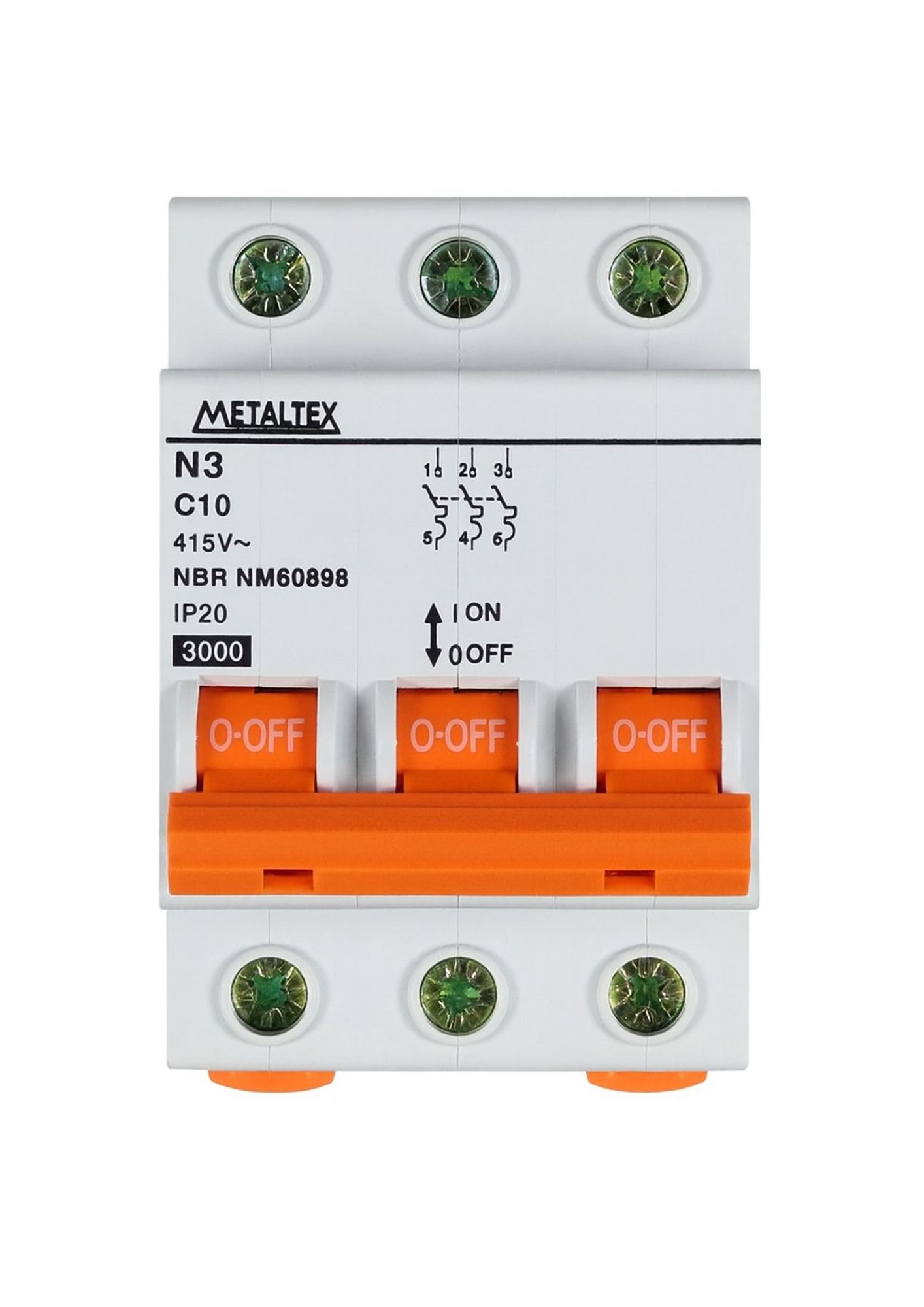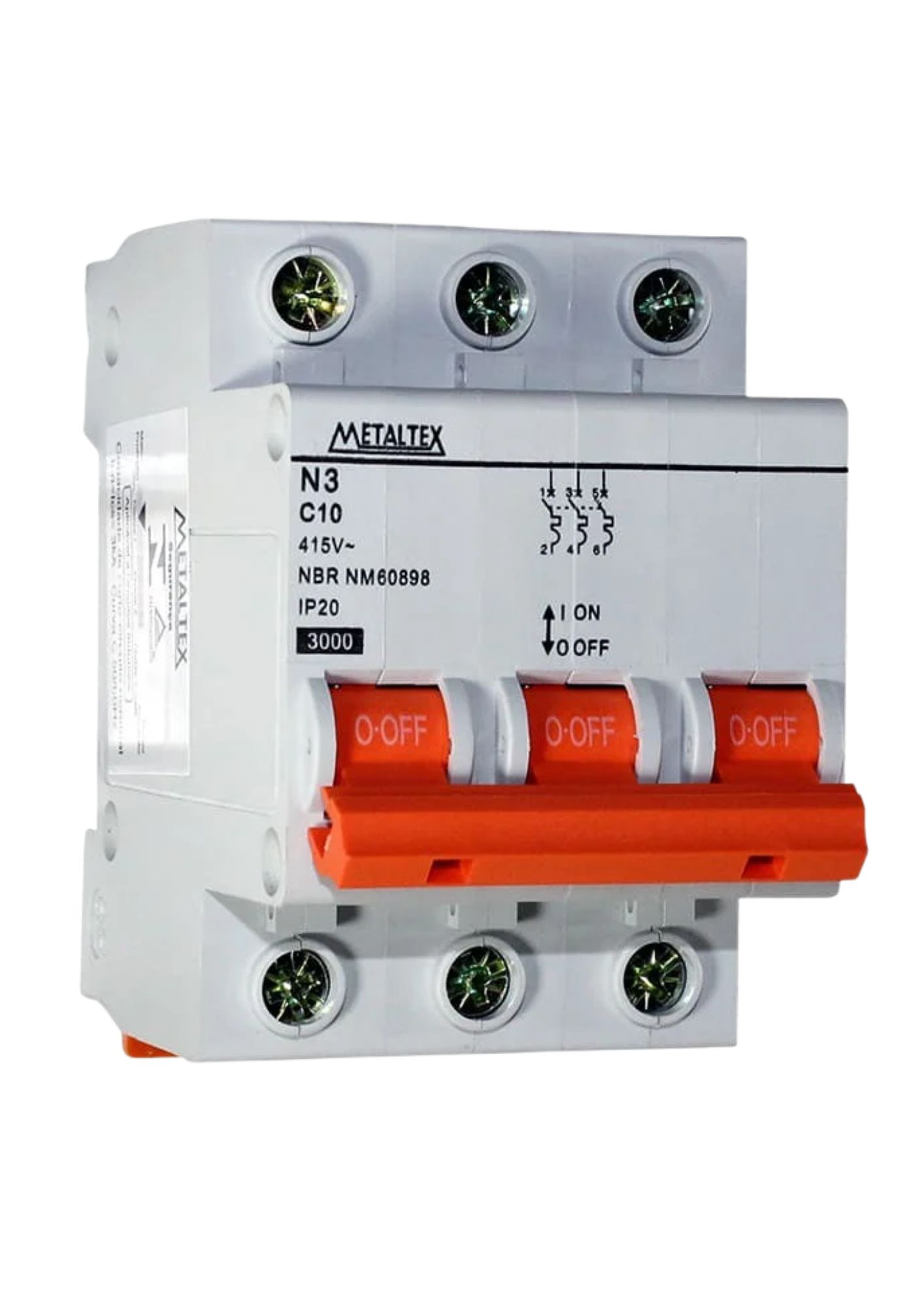 O N3-3C10 é um mini disjuntor tripolar de 10A, curva C, com capacidade de interrupção de 3kA, fabricado pela Metaltex. Este dispositivo é projetado para proteger circuitos elétricos contra sobrecargas e curtos-circuitos, garantindo a segurança em instalações residenciais, comerciais e industriais.