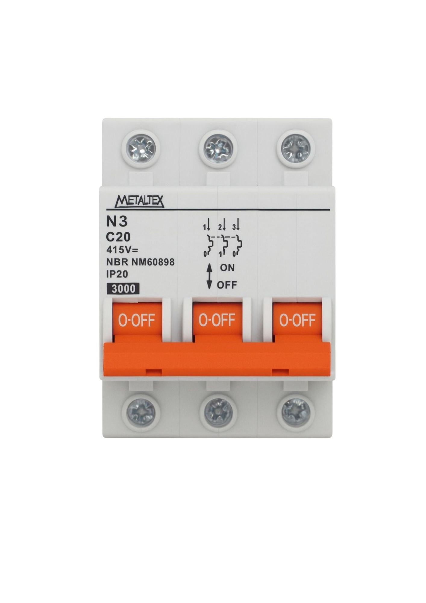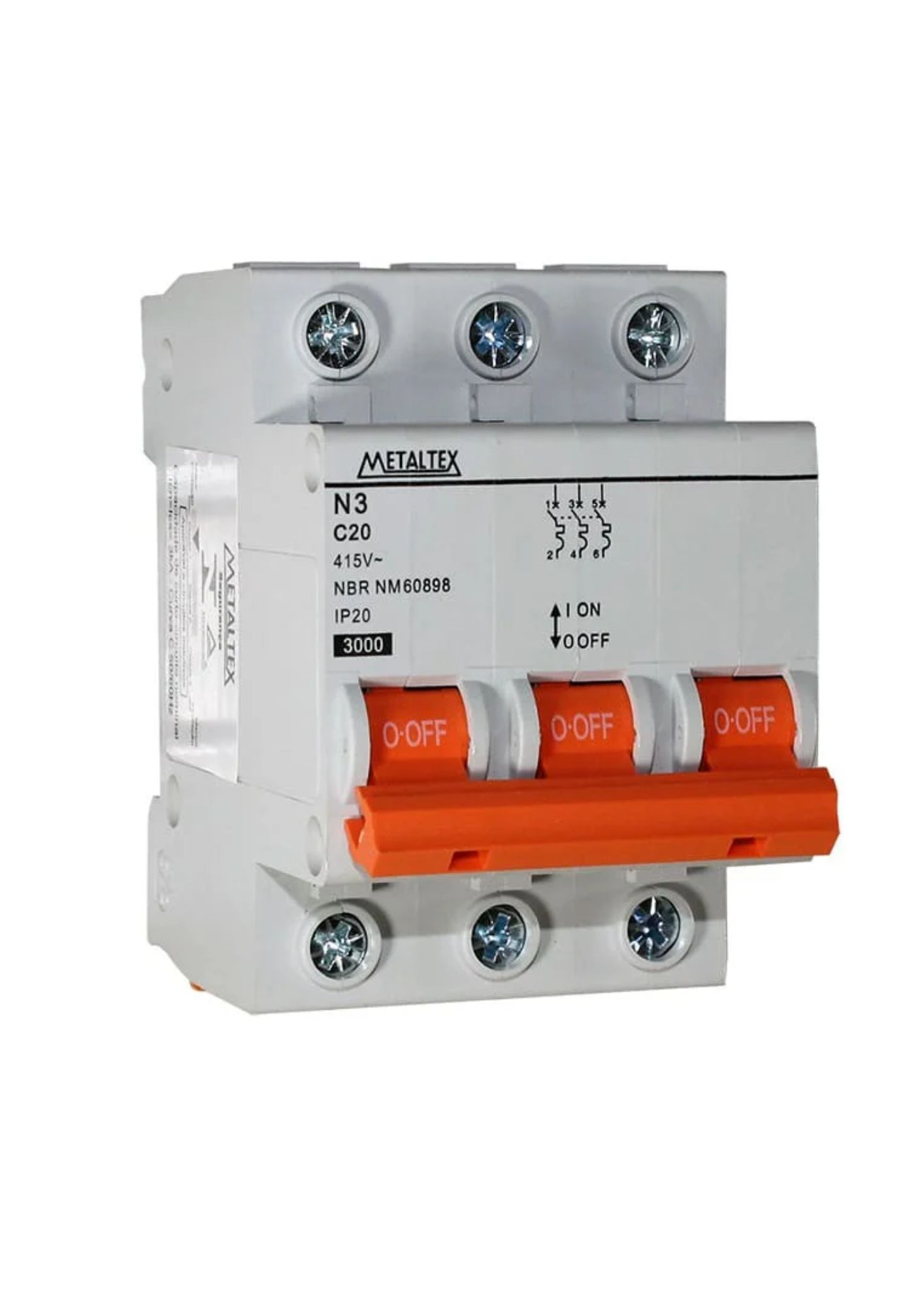 O N3-3C20 é um mini disjuntor tripolar de 20A, curva C, com capacidade de interrupção de 3kA, fabricado pela Metaltex. Este dispositivo é projetado para proteger circuitos elétricos contra sobrecargas e curtos-circuitos, garantindo a segurança em instalações residenciais, comerciais e industriais.