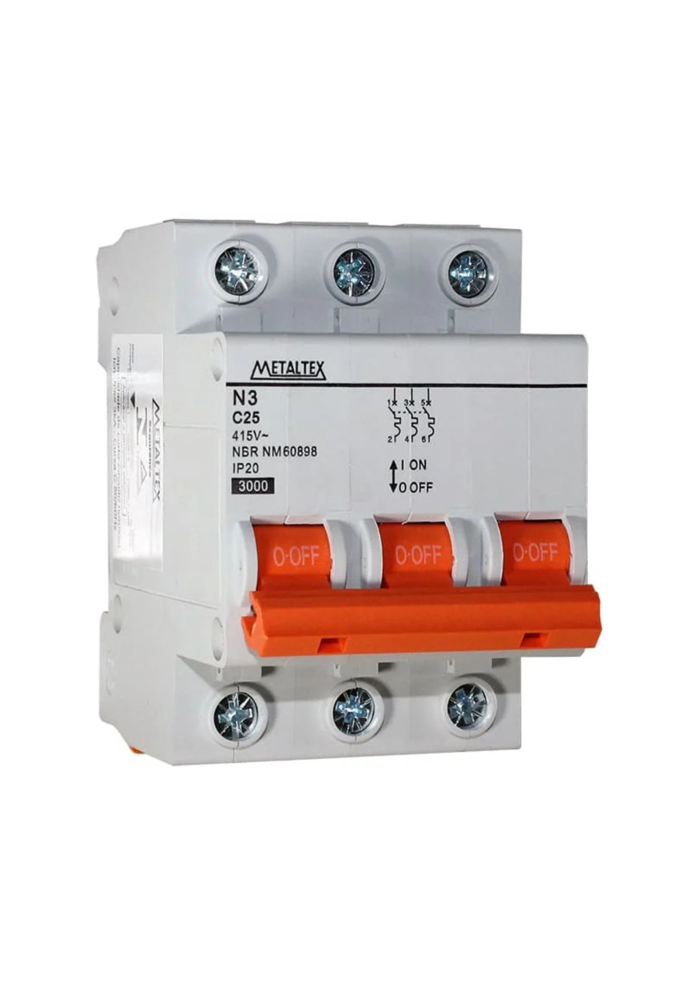 O N3-3C25 é um mini disjuntor tripolar de 25A, curva C, com capacidade de interrupção de 3kA, fabricado pela Metaltex. Este dispositivo é projetado para proteger circuitos elétricos contra sobrecargas e curtos-circuitos, garantindo segurança em instalações residenciais, comerciais e industriais.
