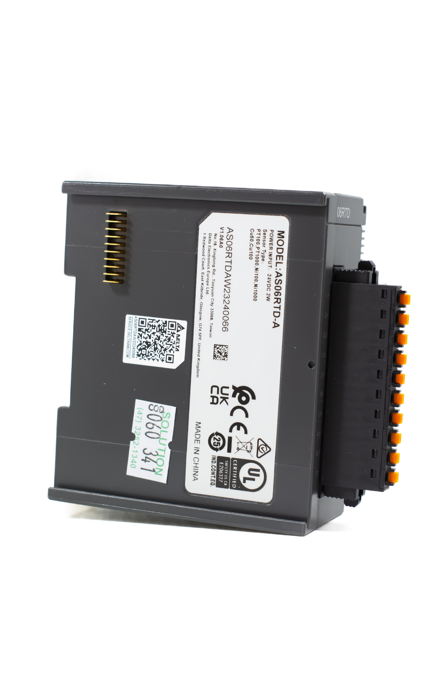 O AS06RTD-A é um módulo de expansão analógico da série AS da Delta Electronics, projetado para adicionar seis entradas de sensores RTD (Resistência Térmica) a um Controlador Lógico Programável (CLP) da série AS. Este módulo é ideal para aplicações que requerem monitoramento preciso de temperatura em processos industriais.