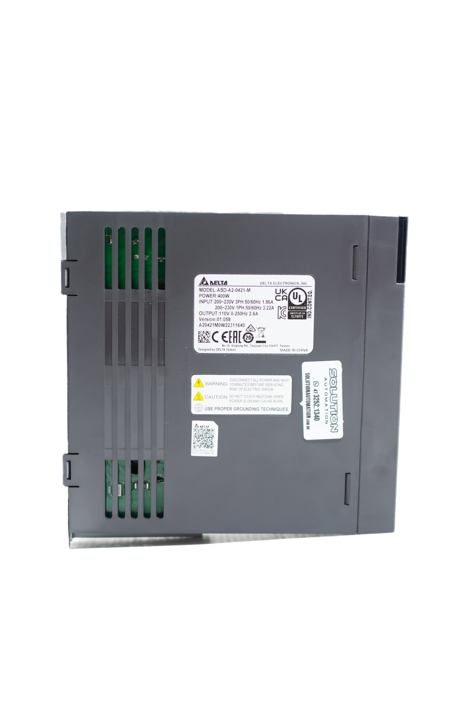O ASD-A2-0421-M é um servo drive da série ASDA-A2 da Delta Electronics, desenvolvido para aplicações industriais de pequeno porte que exigem controle preciso de movimento. Com potência de 0,4 kW (400W) e alimentação 220V monofásica, este modelo oferece excelente desempenho dinâmico, alta precisão e suporte a vários modos de controle.