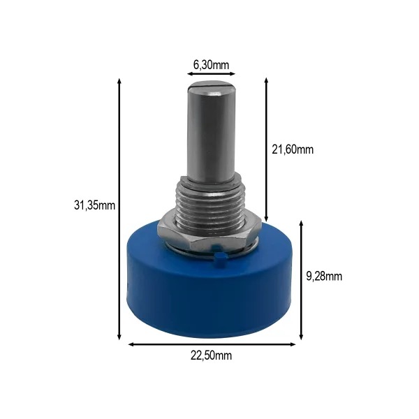 Potenciômetro rotativo de 5K ohms com curso de 1 volta e ajuste contínuo sem limite mecânico de fim de curso (volta infinita). Indicado para aplicações onde é necessário ajuste frequente de sinal ou controle de interface, como em painéis industriais, controles analógicos e equipamentos de áudio. Corpo em material plástico resistente, eixo estriado ou liso conforme modelo, montagem por painel com porca e arruela.