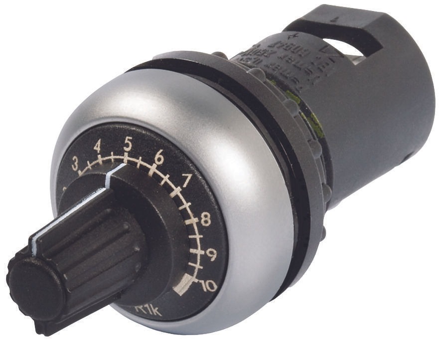 DESCRIÇÃO O potenciômetro rotativo M22 5K é um componente eletromecânico utilizado para variação manual de resistência em circuitos de controle e automação. Projetado para montagem em painéis, ele possui corpo padrão de 22mm de diâmetro, compatível com a linha modular M22, sendo amplamente utilizado em sistemas industriais para ajuste de parâmetros como velocidade, tensão, corrente ou nível de sinal analógico.