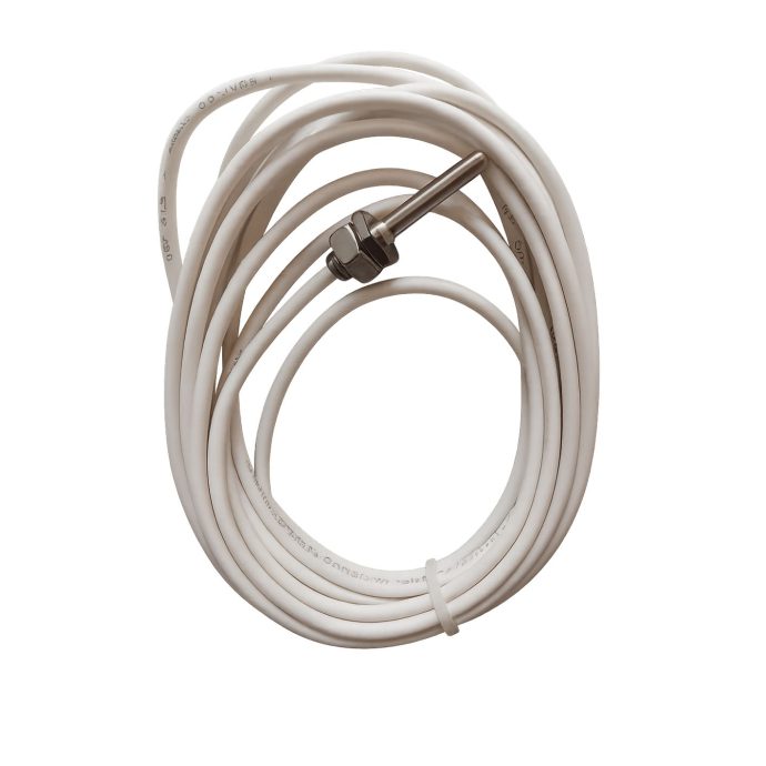 Sensor de temperatura PT-100 modelo KTK-A22A, com haste em aço inoxidável de 35 mm de comprimento e 6,35 mm de diâmetro, cabo de silicone de 5 metros e conexão 3 fios para maior precisão na leitura. Ideal para medições de temperatura em processos industriais, oferecendo alta durabilidade, resistência mecânica e proteção contra umidade e variações térmicas.Produto