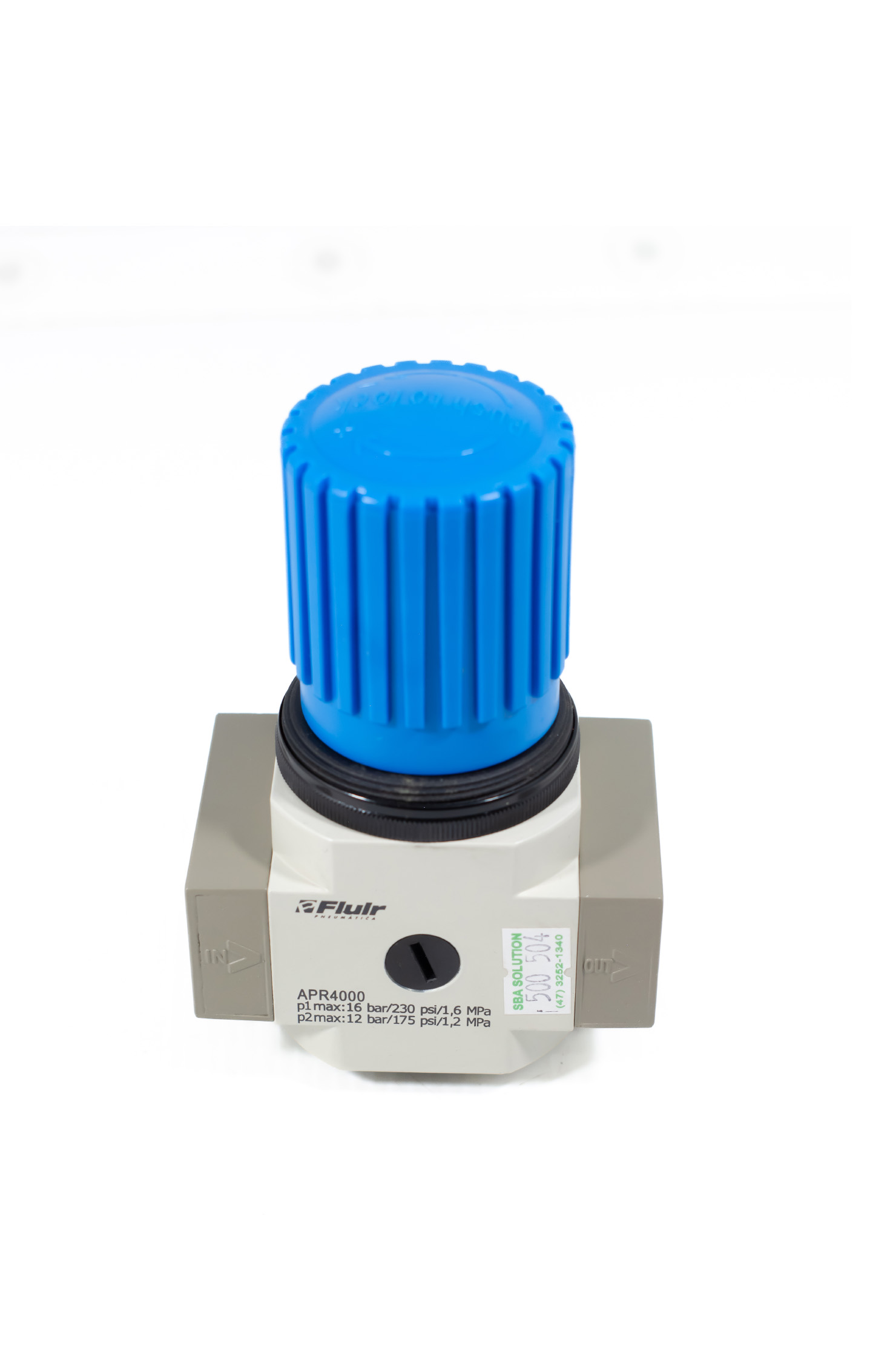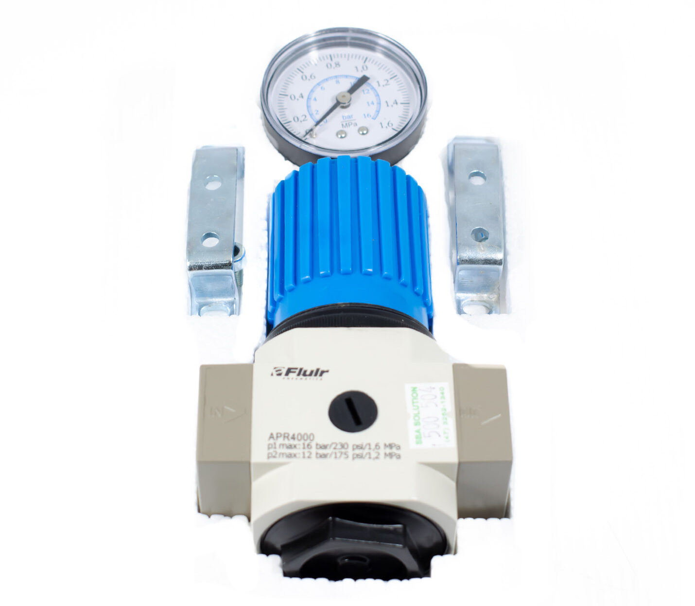 Regulador de pressão modelo APR4000, com conexão de 1/2", acompanhado de suporte e manômetro. Projetado para controlar e estabilizar a pressão do ar comprimido em sistemas pneumáticos, garantindo maior eficiência e proteção dos componentes.