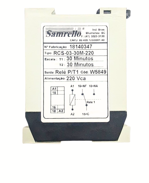 O relé temporizador cíclico RCS-03-30M-220 (cód. 5849 SAMRELLO) é um dispositivo eletrônico utilizado para realizar ciclos automáticos de acionamento e desligamento, operando com alimentação em 220Vca. É indicado para controle intermitente de cargas elétricas em sistemas de automação industrial.