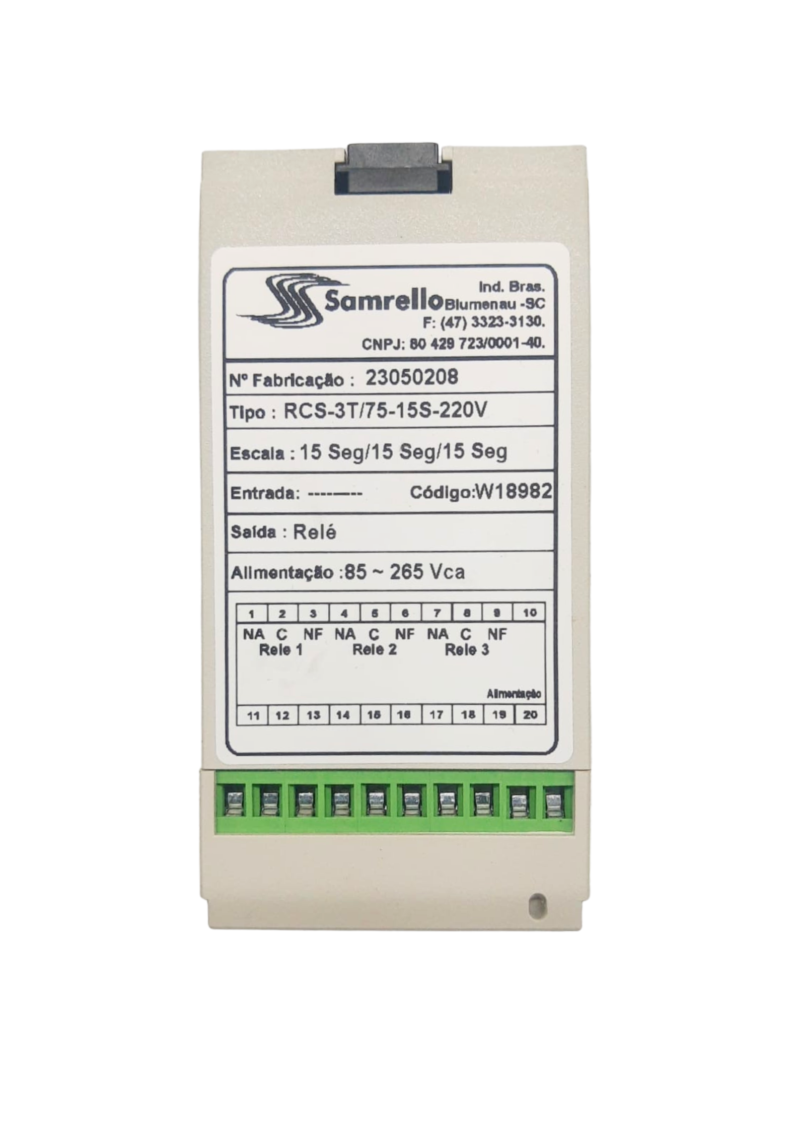O relé cíclico RCS-3T/75-220V (código 18982) é um temporizador eletrônico utilizado para controle de ciclos automáticos com três tempos independentes (T1, T2 e T3). Alimentado em 220 VCA, permite sequenciar acionamentos de forma repetitiva, sendo indicado para processos que exigem múltiplas etapas temporizadas em sistemas de automação industrial.