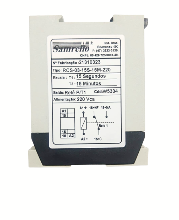 O relé temporizador cíclico RCS-03-15S-15M (cód. 5334) é um dispositivo eletrônico utilizado para realizar ciclos automáticos de acionamento e desligamento, operando com alimentação em 220Vca.