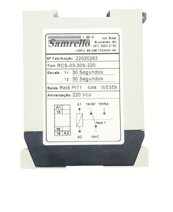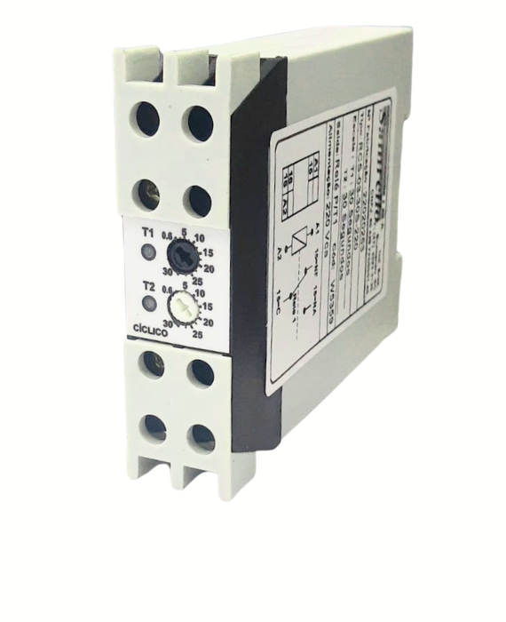 O relé temporizador cíclico RCS-03-30S-220 T1 e T2 (cód. 5359) é um dispositivo eletrônico utilizado para realizar ciclos automáticos de acionamento e desligamento, operando com alimentação em 220Vca. Possui ajuste independente dos tempos, sendo indicado para controle intermitente de cargas em automação industrial.