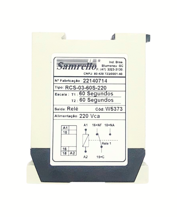 O relé temporizador cíclico RCS-03-60S-220 T1 T2 (cód. 5373) é um dispositivo eletrônico utilizado para realizar ciclos automáticos de acionamento e desligamento, operando com alimentação em 220Vca. Possui ajuste independente de tempos, sendo indicado para controle intermitente de cargas em automação industrial.