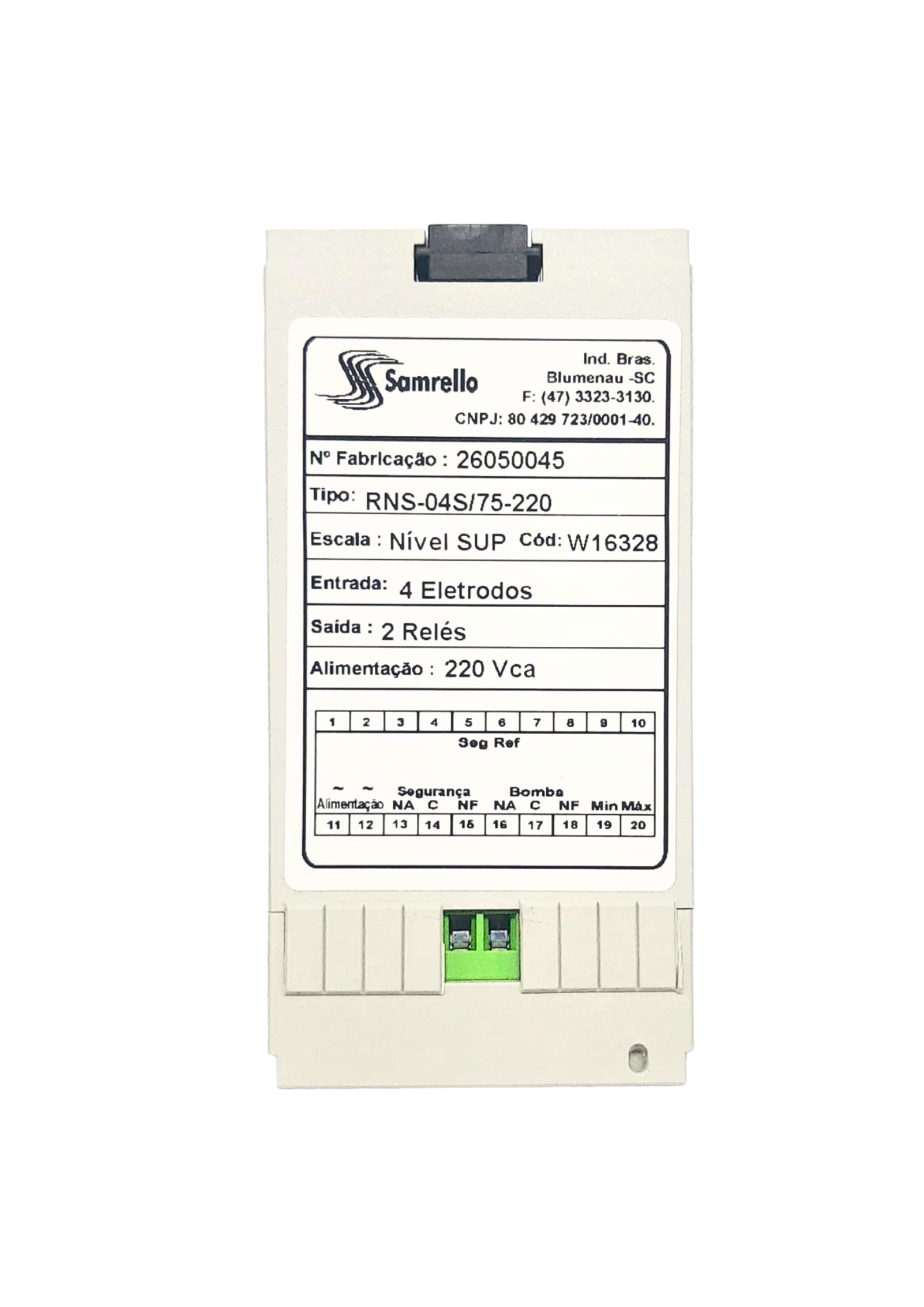 O relé de nível RNS-04S/75-220 ALM (código 16328) é um dispositivo utilizado para controle e monitoramento de nível de líquidos em reservatórios, caixas d’água, poços e sistemas industriais. Sua função é acionar ou desligar bombas e alarmes conforme o nível do líquido, evitando transbordamentos ou funcionamento a seco.