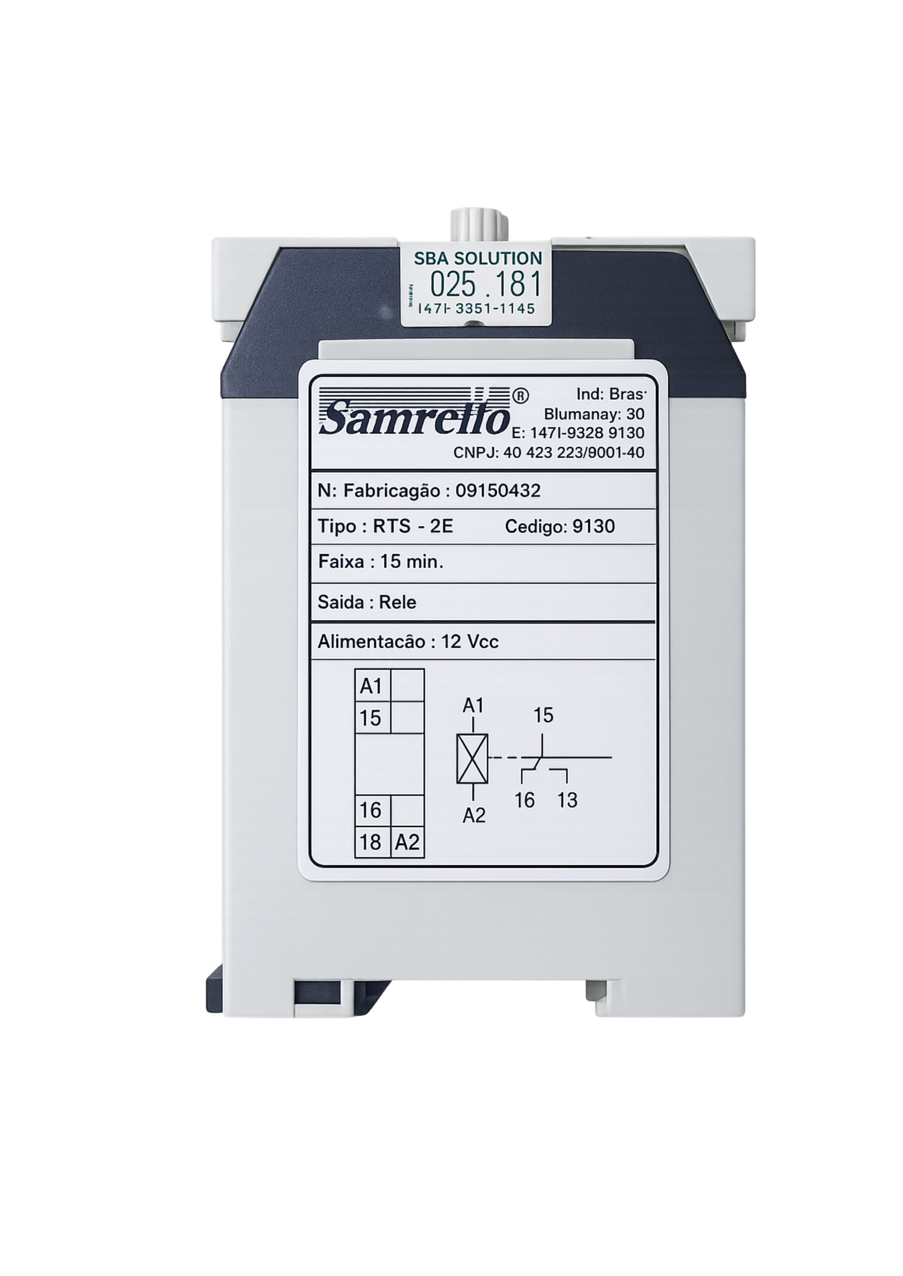 O relé temporizador RTS-2E é um temporizador analógico de retardo na energização projetado para aplicações em quadros de comando e controle automático. Ele aguarda um tempo definido (no caso, ~15 min) após ser energizado e só então aciona seu contato de saída. Esse tipo de relé é muito usado quando você quer fazer algo esperar antes de ligar — tipo uma parada dramática antes do show começar