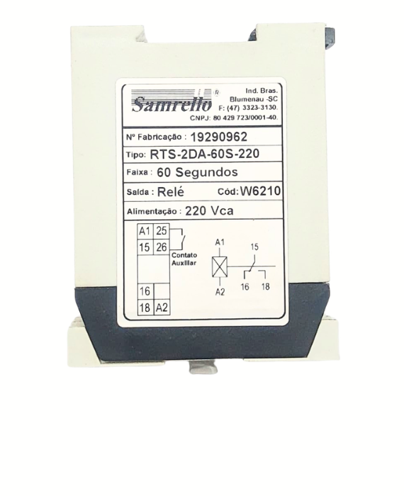O relé temporizador RTS-2DA 60S 220Vca (cód. 6210) é um dispositivo eletrônico temporizador acionado por botão de partida, utilizado para controle temporizado de cargas elétricas. Opera com alimentação em 220Vca, sendo indicado para aplicações onde é necessário um acionamento por pulso com tempo definido.