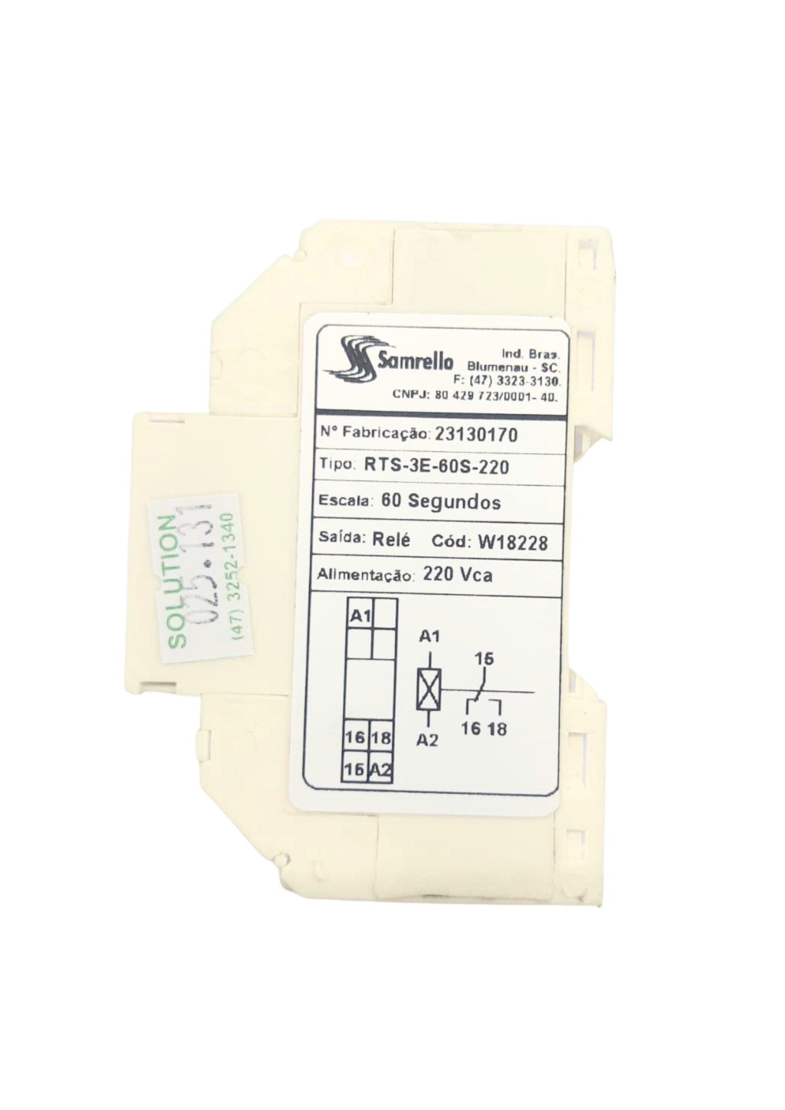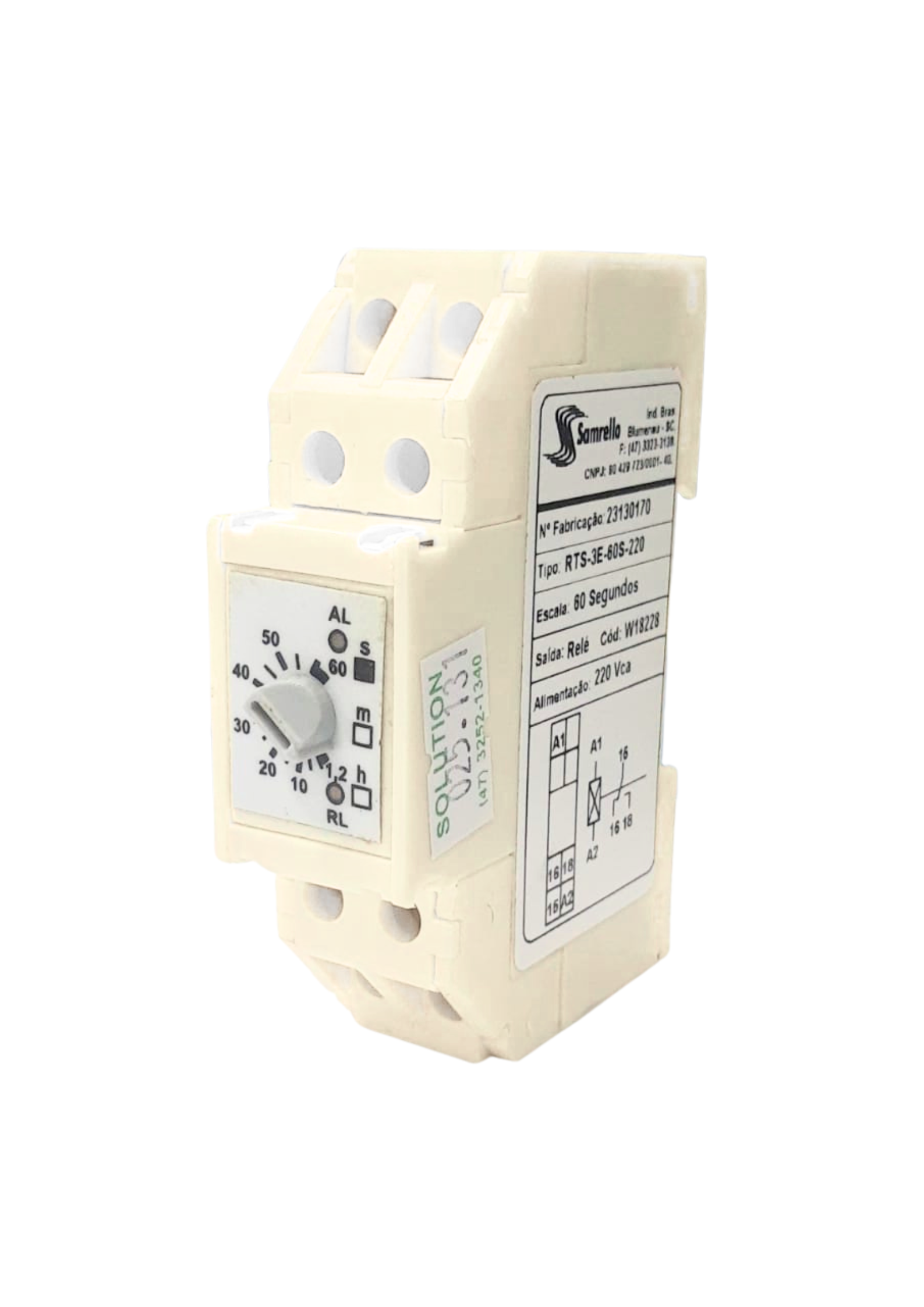 Com alimentação em 220 Vca e faixa de temporização de até 60 segundos, é indicado para processos que necessitam de um atraso maior na partida, sendo amplamente utilizado em painéis elétricos, máquinas industriais e sistemas automatizados.