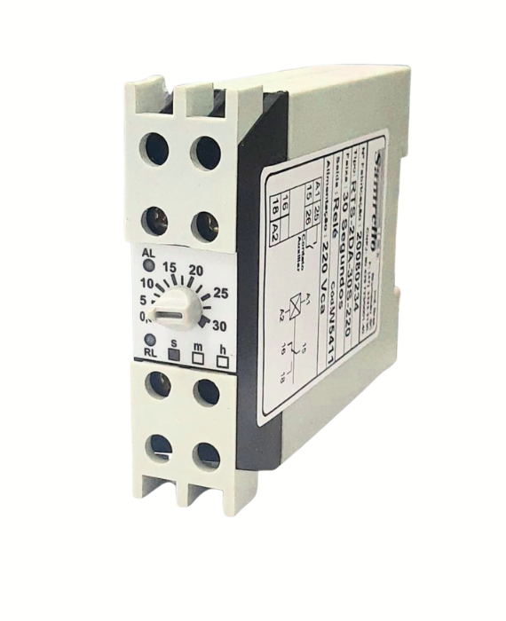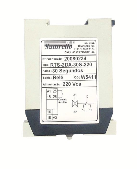O relé temporizador RTS-2DA-30S-220 (cód. 5411 SAM) é um dispositivo eletrônico temporizador acionado por botão de partida, utilizado para controle temporizado de cargas elétricas, operando com alimentação em 220Vca. Indicado para aplicações onde é necessário um acionamento por pulso com tempo definido.