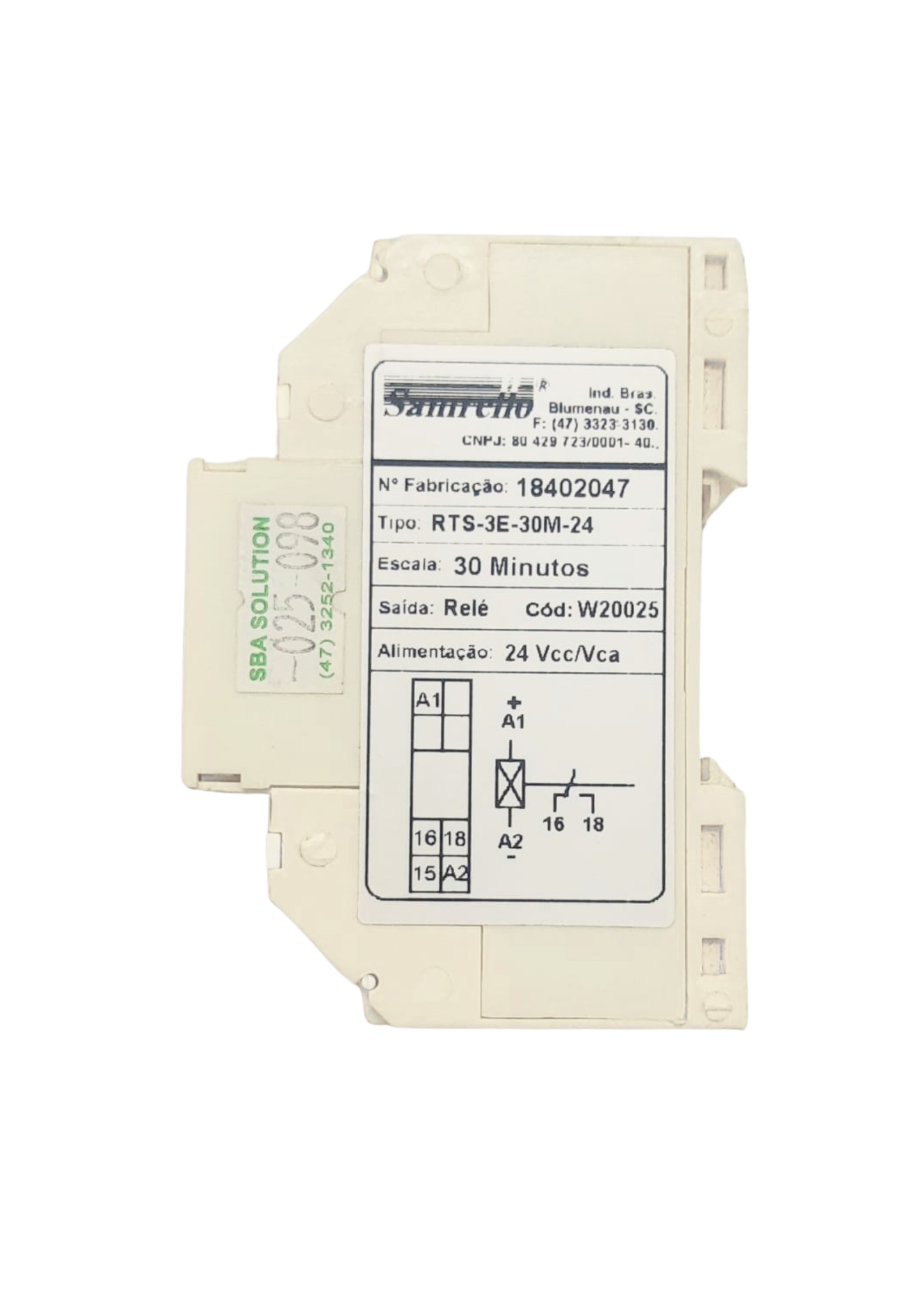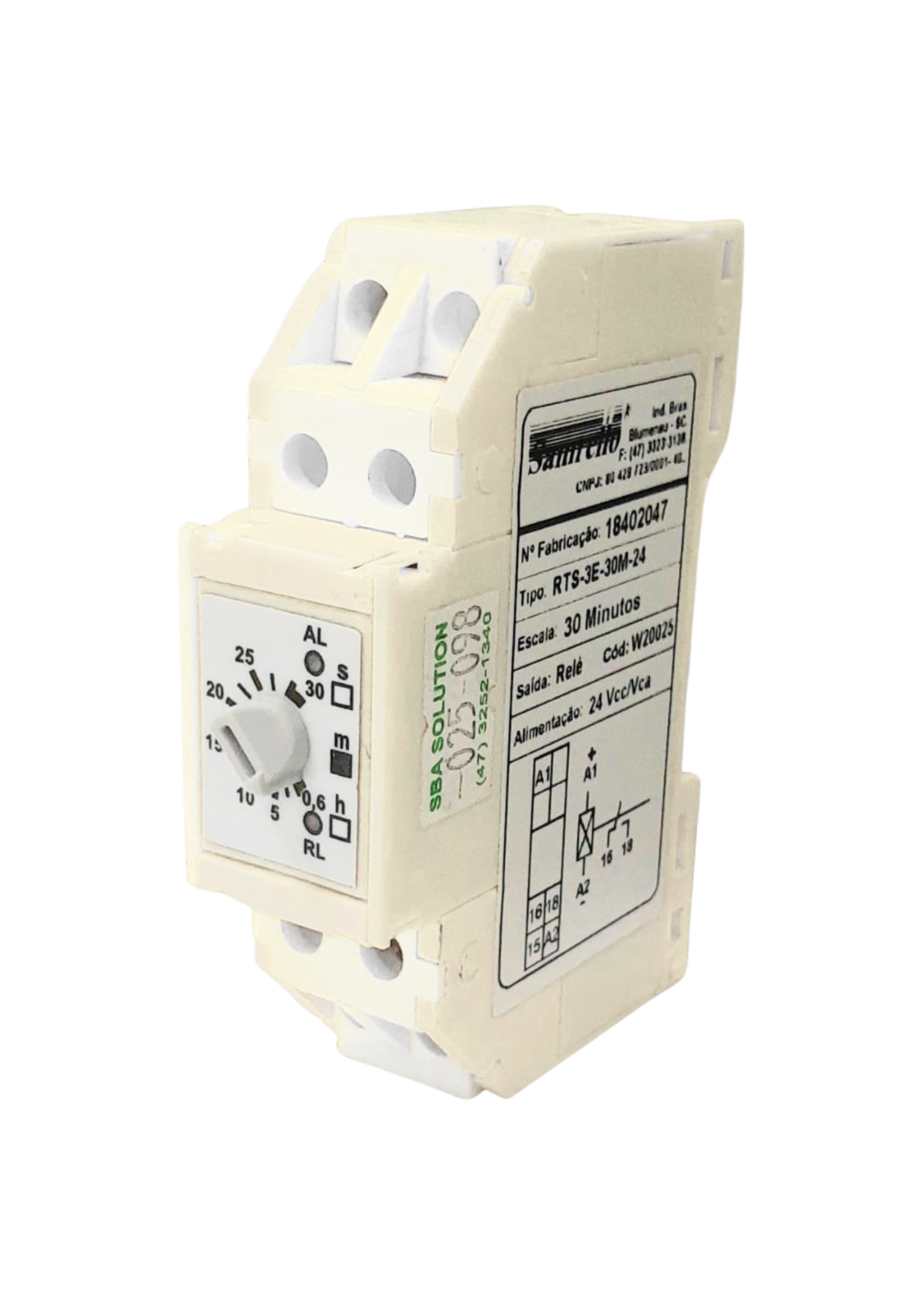 O relé temporizador RTS-3E-30M-24 (código 20025 – SAM) é um dispositivo utilizado para controle de tempo em sistemas elétricos e de automação industrial, com função de retardo na energização. Sua principal aplicação é atrasar o acionamento de cargas após a alimentação do circuito, permitindo melhor sequenciamento e proteção dos equipamentos.