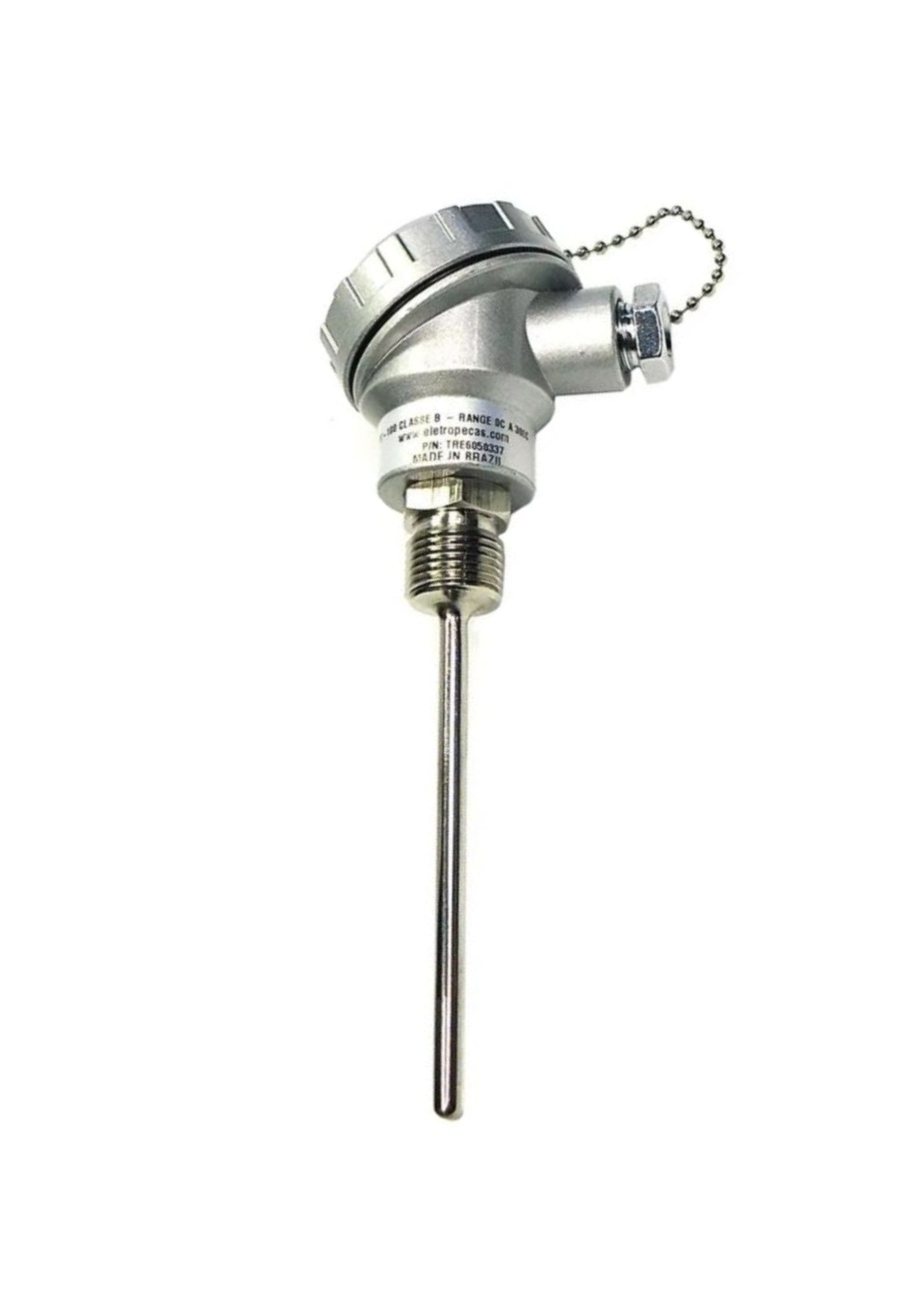 Sensor PT-100 duplo de alta precisão, construído em aço inoxidável com haste de 300 mm e diâmetro de 8 mm, rosca de fixação 1/2”, ideal para aplicações industriais que exigem robustez, confiabilidade e medições estáveis de temperatura.