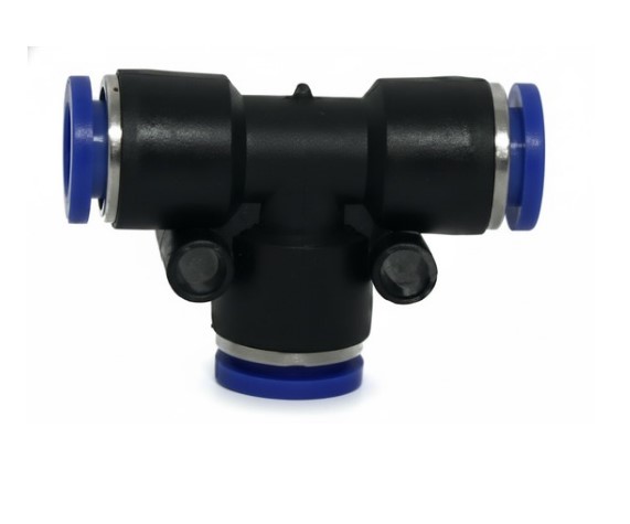 Conexão tipo “T” redutora para tubos pneumáticos, permitindo derivar a linha principal de 12 mm para uma saída de 10 mm. Garante vedação eficiente, montagem rápida e distribuição segura do ar comprimido em sistemas de automação.Produto